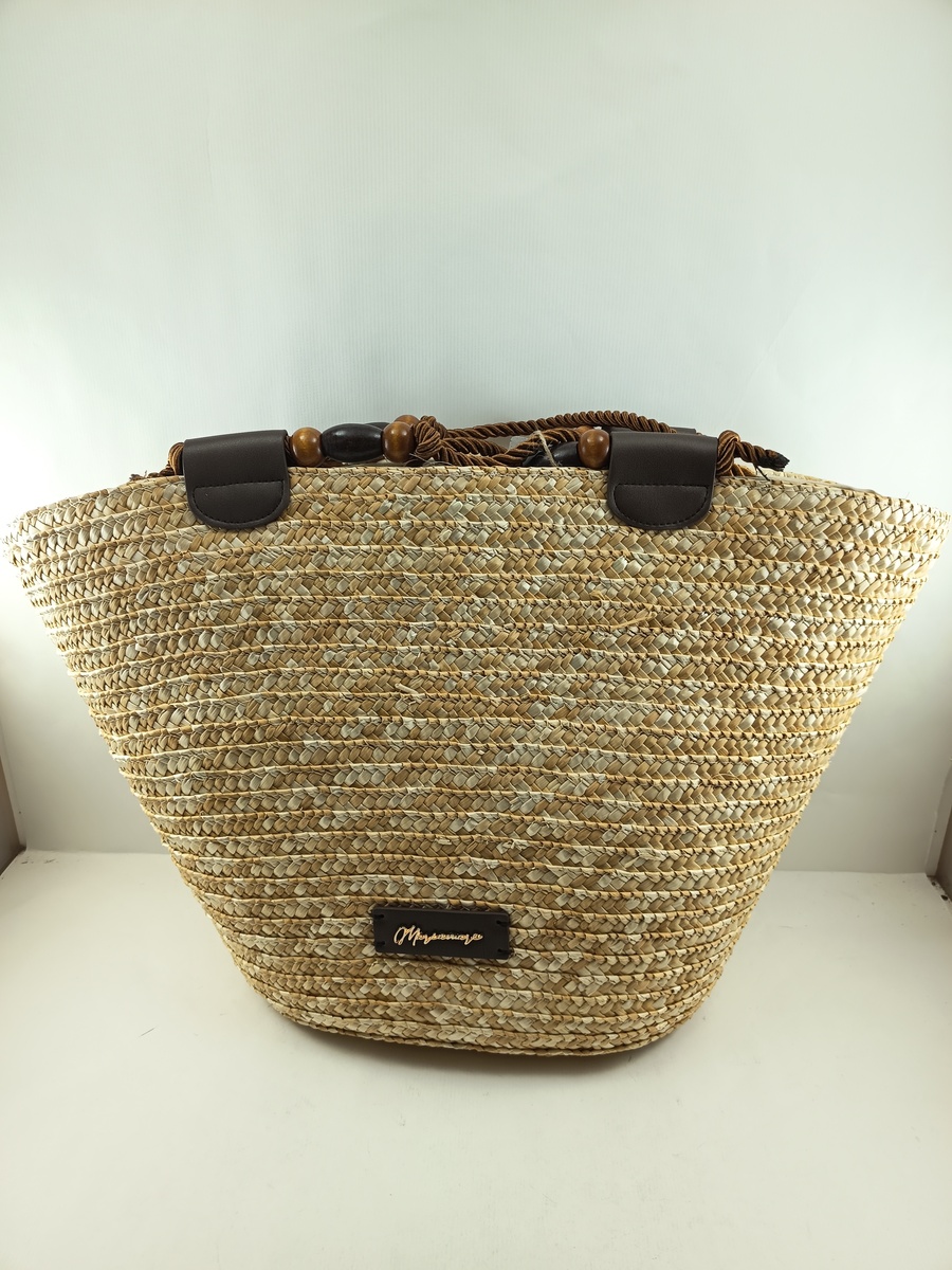Bolso tipo capazo natural con cierre de cremallera y varios departamentos interiores.