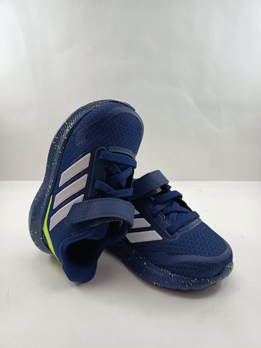 Deportivo sintetico azul con cierre de cordon y suela de goma, forro y plantilla textil, detalles de acabados en neón y suela y logo en blanco.