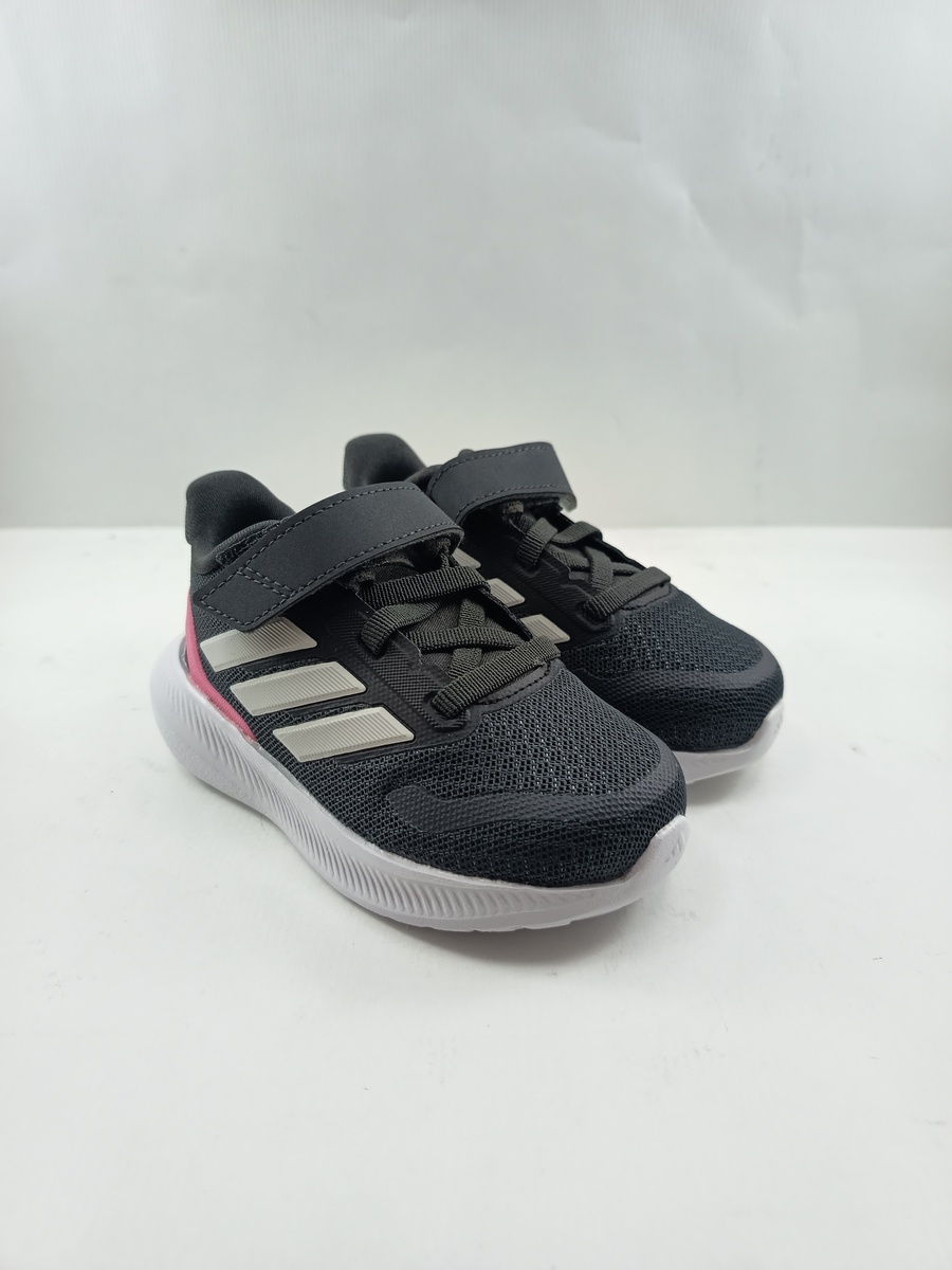 Deportivo sintetico gris con cierre de velcro y suela de goma, forro y plantilla textil, detalle de acabados en rosa, suela y logo en blanco.