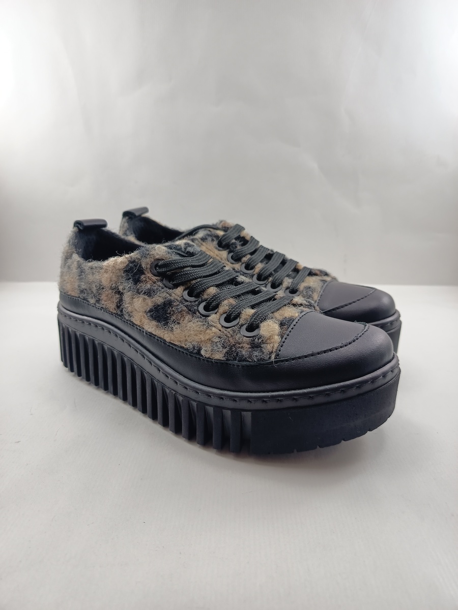 Semi-sport de piel multicolor con cierre de cordon y suela de goma, forro y plantilla de piel, detalle de leopardo en toda ella, puntera y suela en negro.
