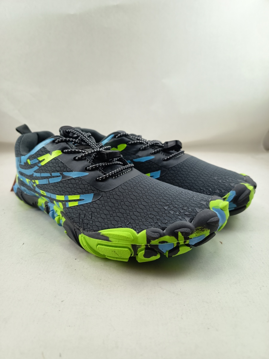 Semi-sport sintetico gris con cierre de cordon elastico y suela de goma barefoot, forro y plantilla textil, ideal para senderismo.