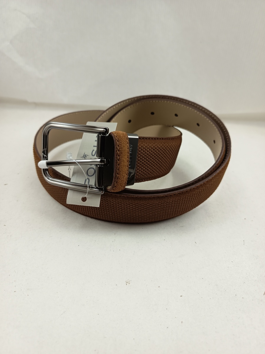 Cinturon de piel marron biselado con cierre de hebilla y reversible.