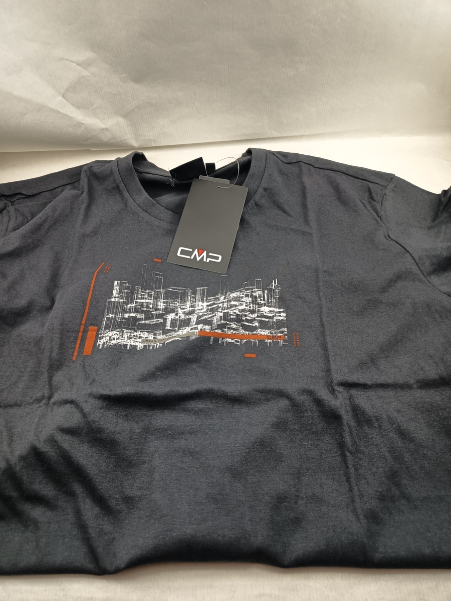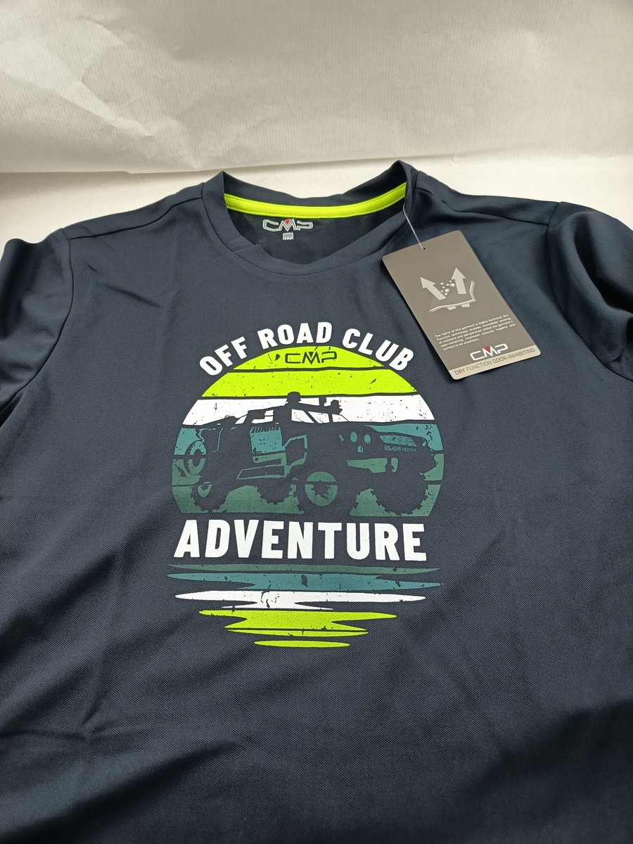 Camiseta manga corta sintetica negra sin cierres y cuello redondeado, con dibujo de coche en pectoral.