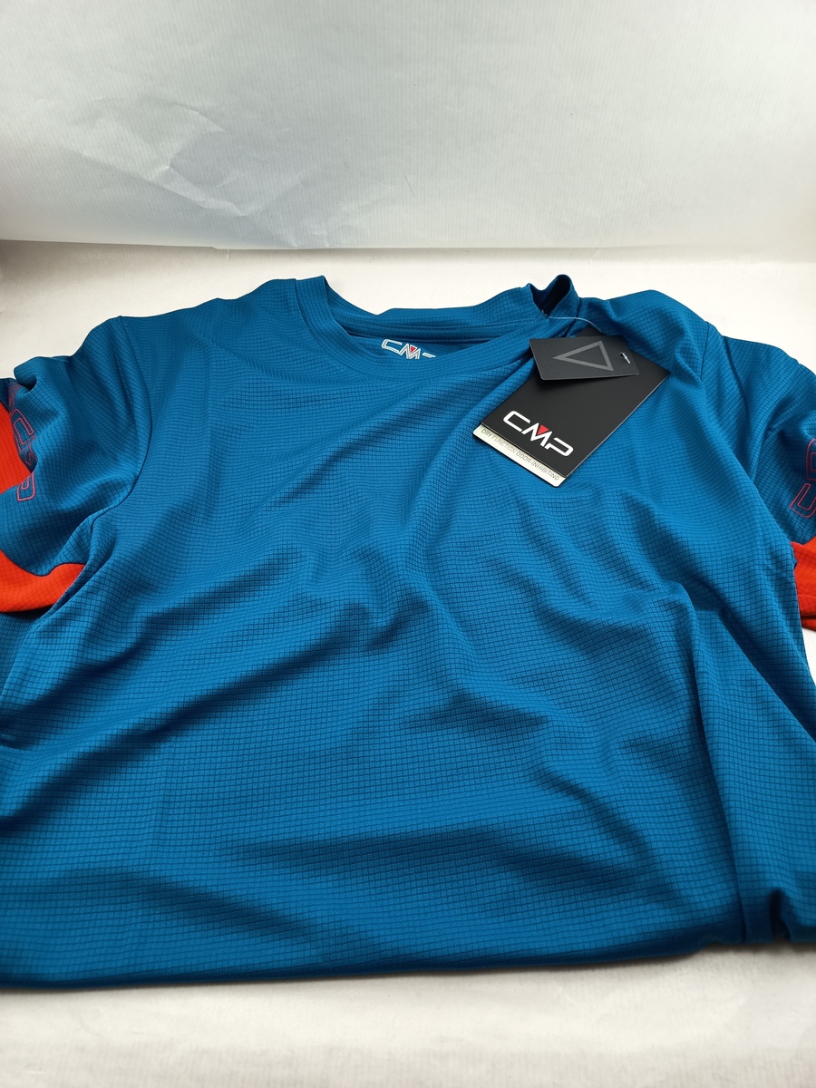 Camiseta manga corta sintetica naranja sin cierres y cuello redondeado.