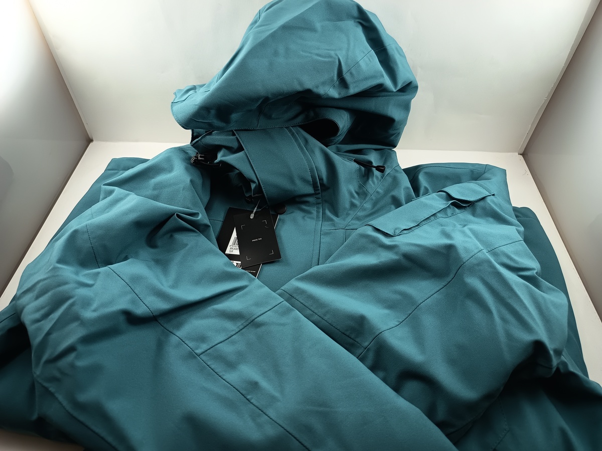 Chaqueta sinetetica verde con cierre de cremallera y bolsillos laterales, detalle de capucha.