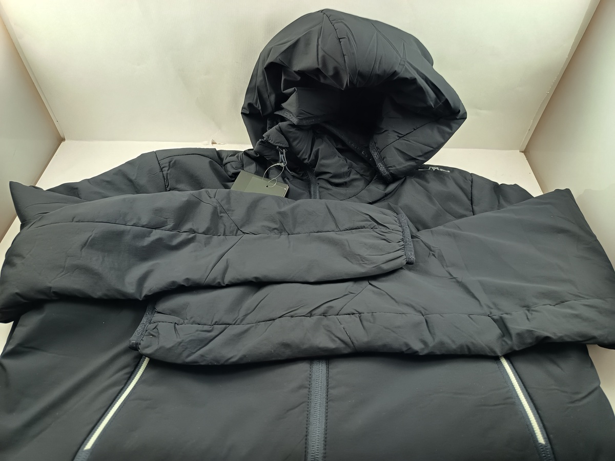 Chaqueta sintetica negra con cierre de cremallera y bolsillos.