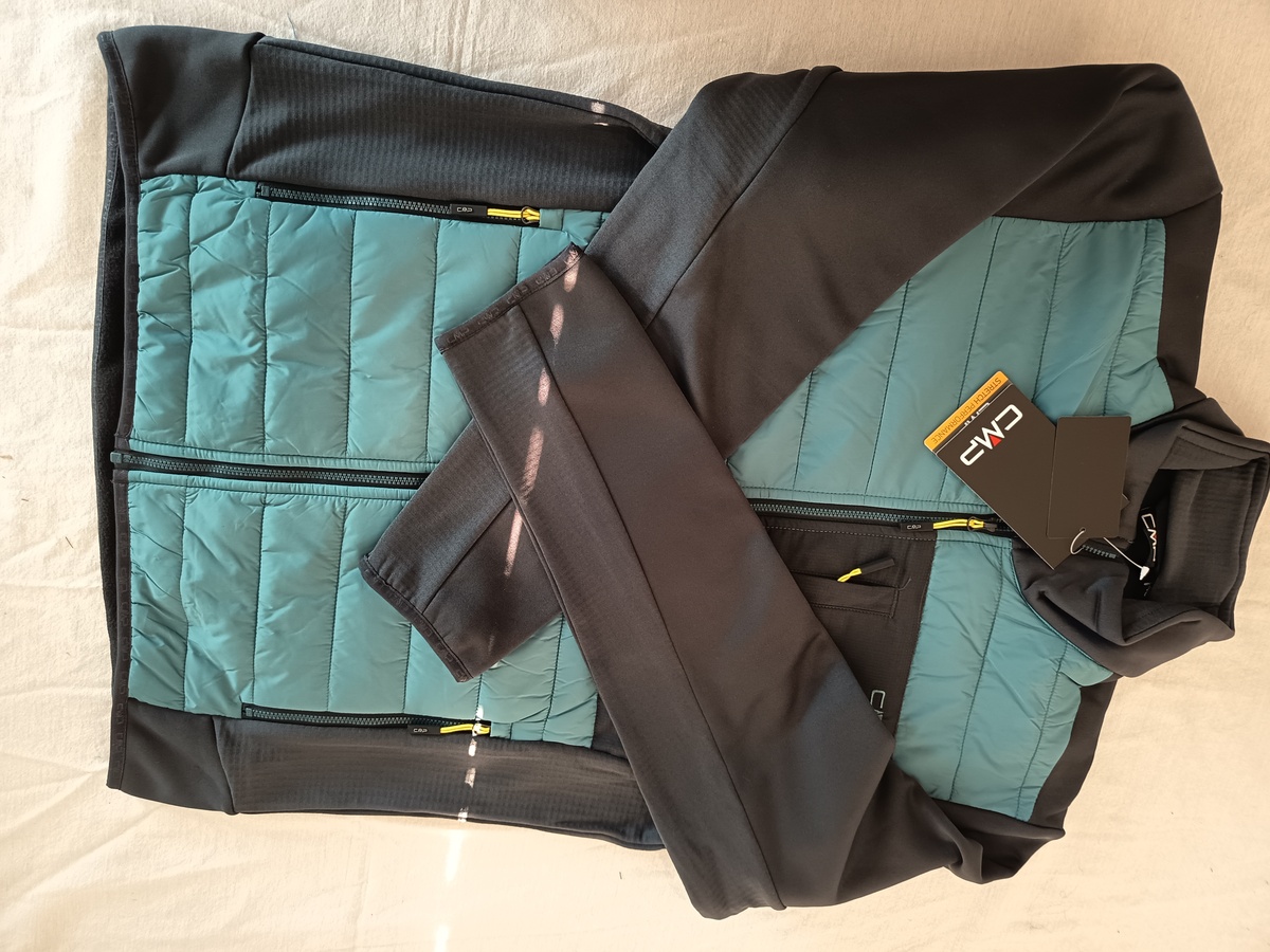 Chaqueta sintetica azul con cierre de cremallera sin capucha, modelo hibrido.
