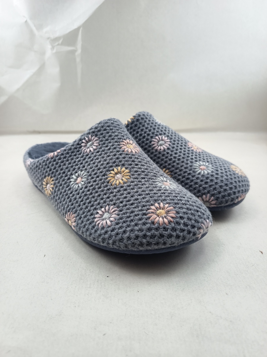 Alpargata de casa tipo chancla sintetica gris sin cierres y suela de goma con cuña de 2, forro y plantilla textil, detalle de flores en toda ella.