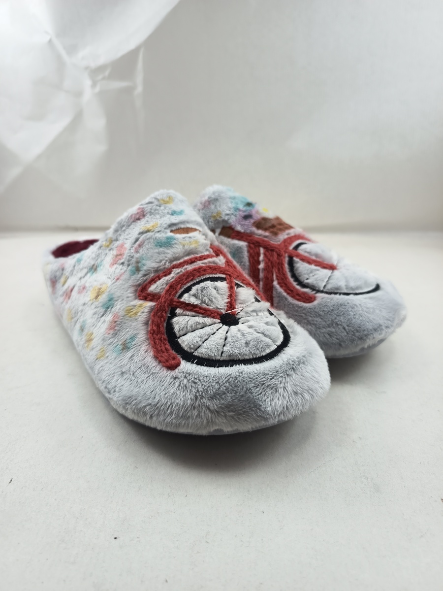 Alpargata de casa tipo chancla sintetica multicolor sin cierres y suela de goma, forro y plantilla textil, detalle de bicicleta en empeine.