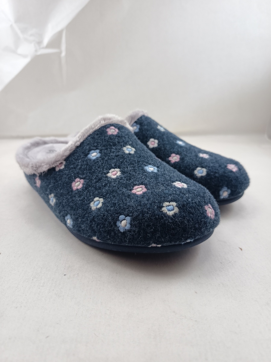 Alpargata de casa tipo chancla sintetica azul sin cierres y suela de goma con cuña de 2, forro y plantilla textil, detalle de flores en toda ella.