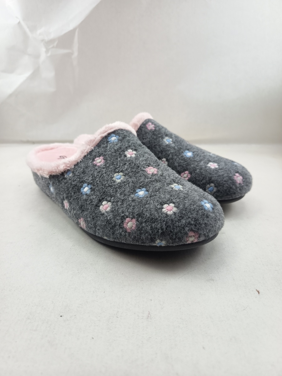 Alpargata de casa tipo chancla sintetica gris sin cierres y suela de goma con cuña de 2, forro y plantilla textil, detalle de flores en toda ella.