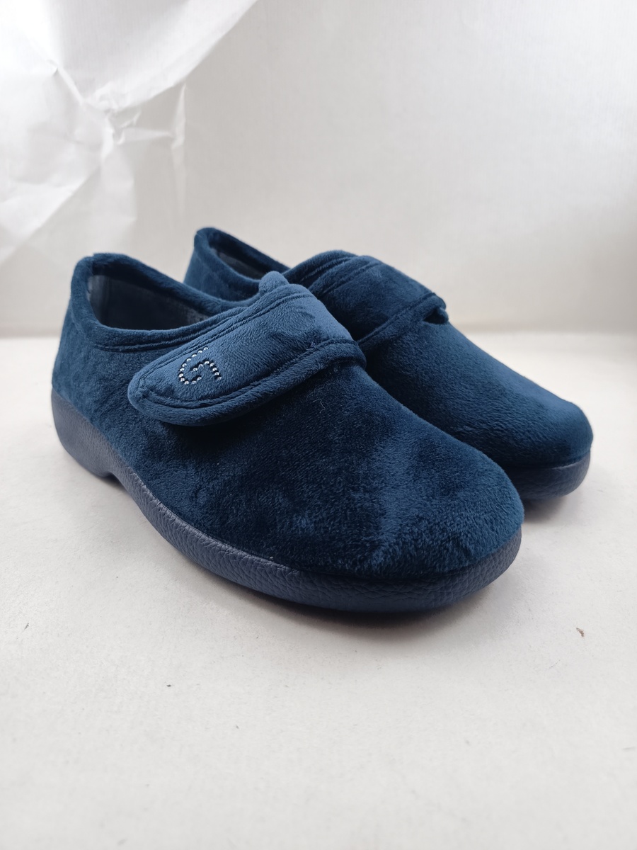 Alpargata sintetica azul con cierre de velcro y suela de goma, forro y plantilla textil.