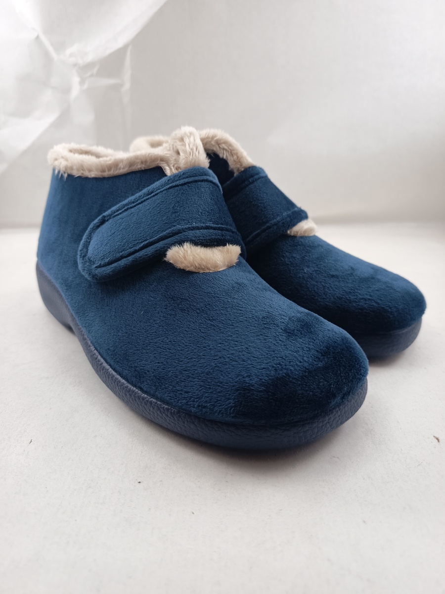 Alpargata de casa tipo bota sintetica azul con cierre de velcro y suela de goma, forro y plantilla textil, detalle de perro en empeine.