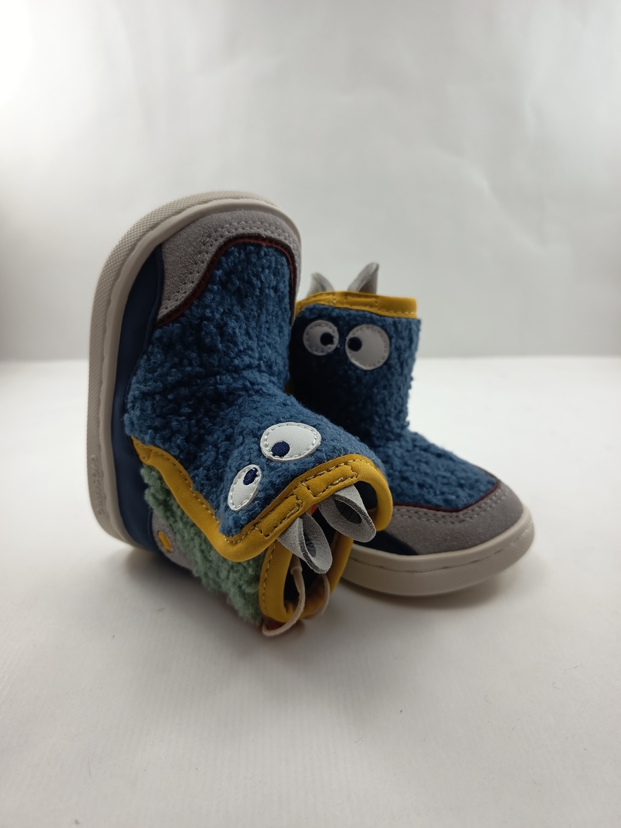 Zapatilla tipo bota sintetica azul con cierre de velcro y suela de goma, forro y plantilla textil, detallle de muñeco en lateral exterior.