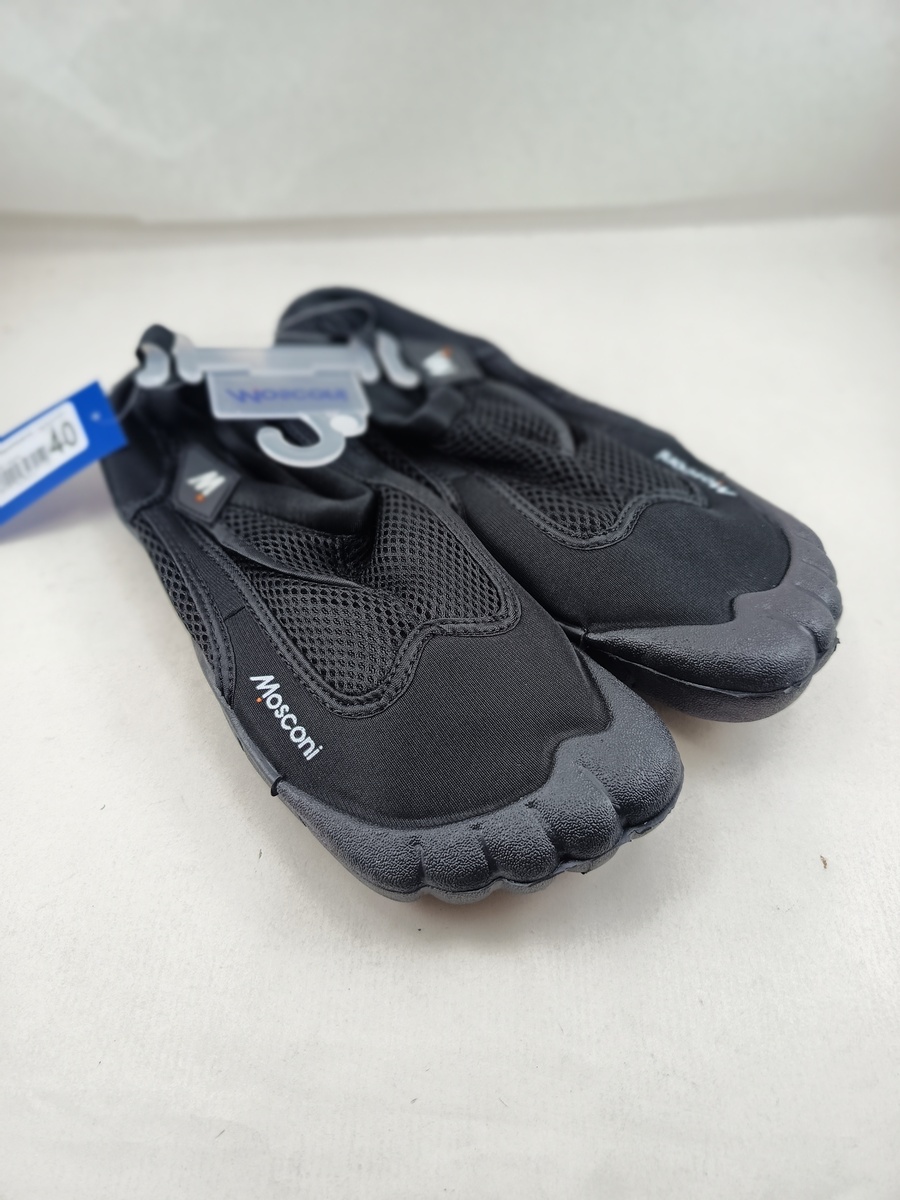 Scarpin sintetico negro con cierre de velcro y suela de goma, detalle de dibujo de los dedos.