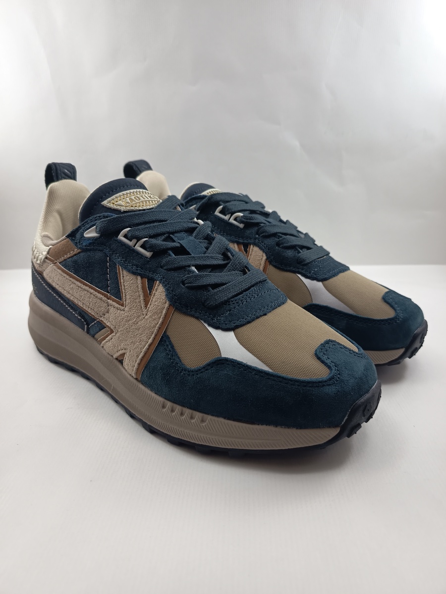 Semi-sport de piel azul con cierre de cordon y suela de goma, forro y plantilla textil, detalle de la marca en lateral exterior color crema y suela en blanco.