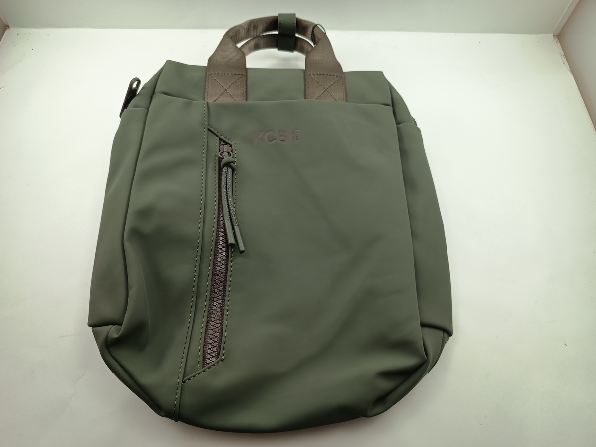 Mochila mediana sintetica verde con cierre de cremallera y varios departamentos interiores.
