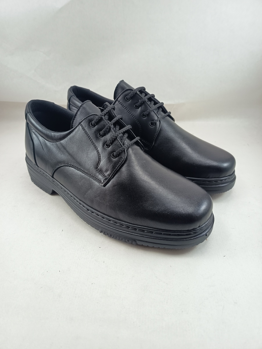Zapato de piel negra con cierre de cordon y suela de goma, forro y plantilla de piel, de bordon en puntera.