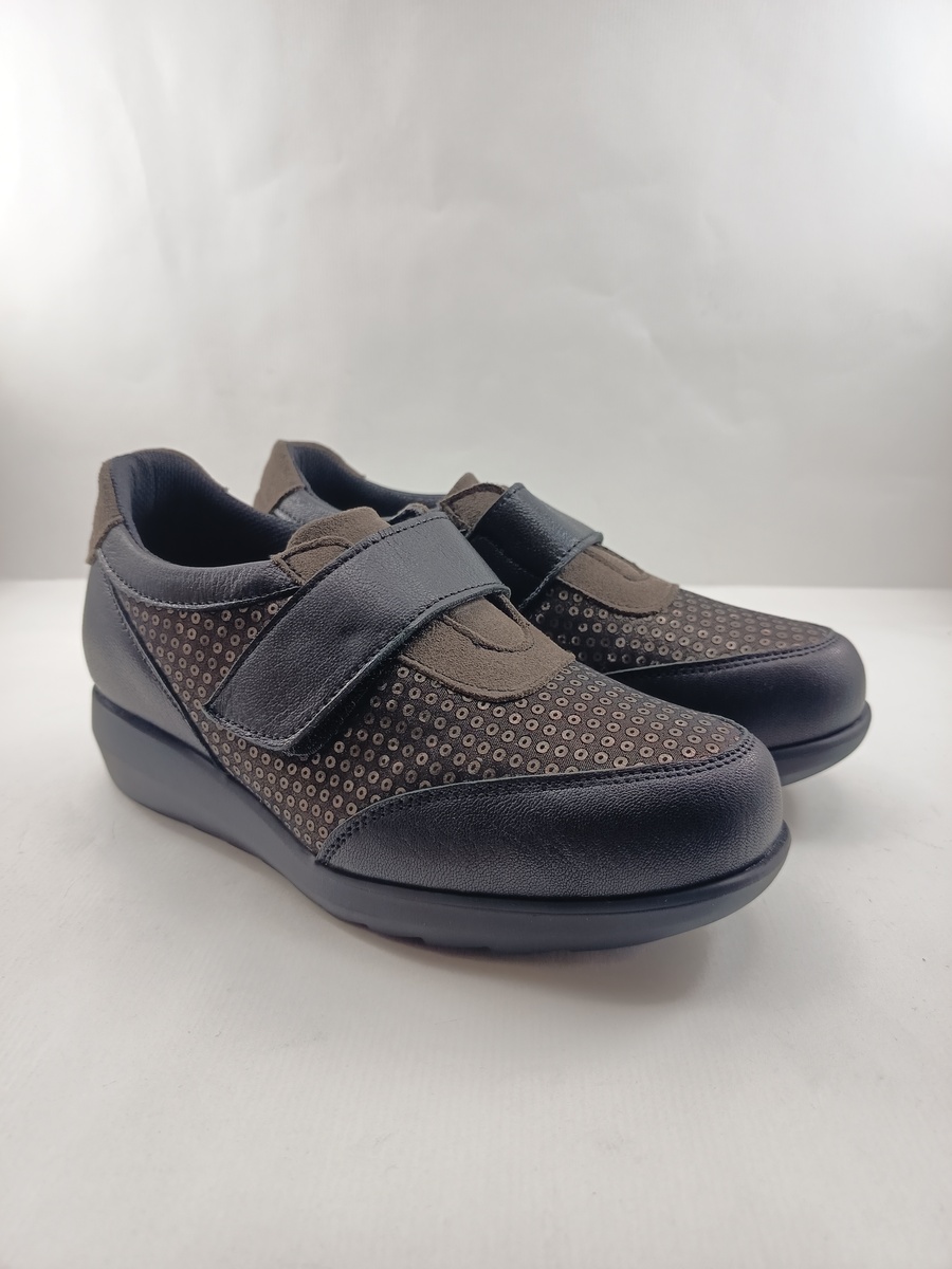 Blucher de piel negra con cierre de velcro y suela de goma, forro y plantilla textil.