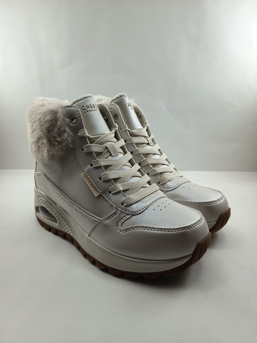 Bota sintetica blanca con cierre de cordon y suela de goma, forro y plantilla textil, detalle de camara vista y pelo en pierna.