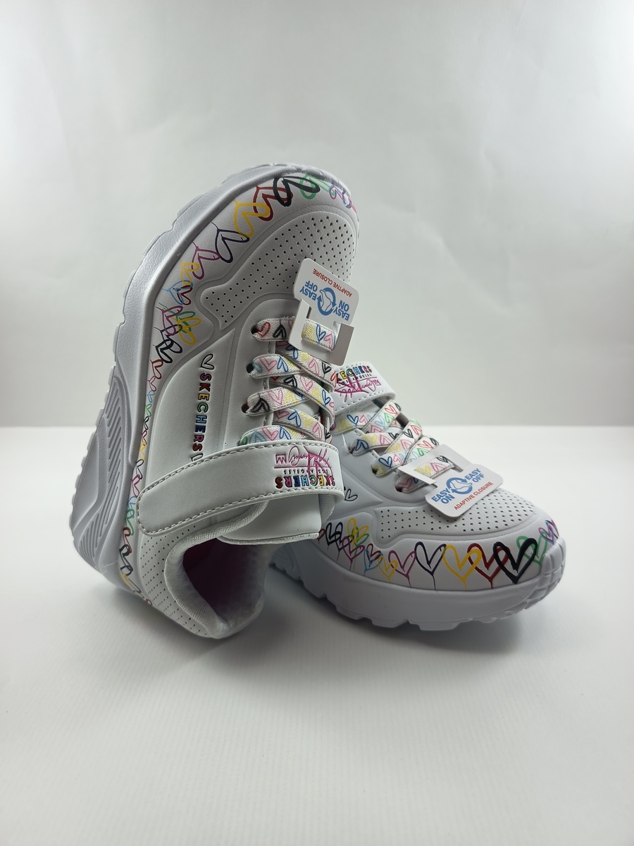 Semi-sport de piel blanca con cierre de cordon en empeine central y suela de goma, forro y planilla textil, detalle de corazones multicolor en lateral exterior.