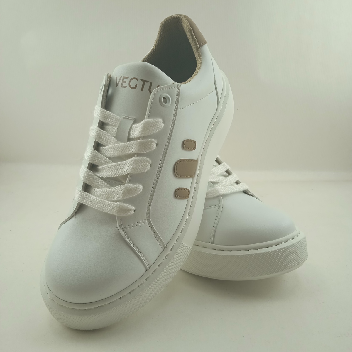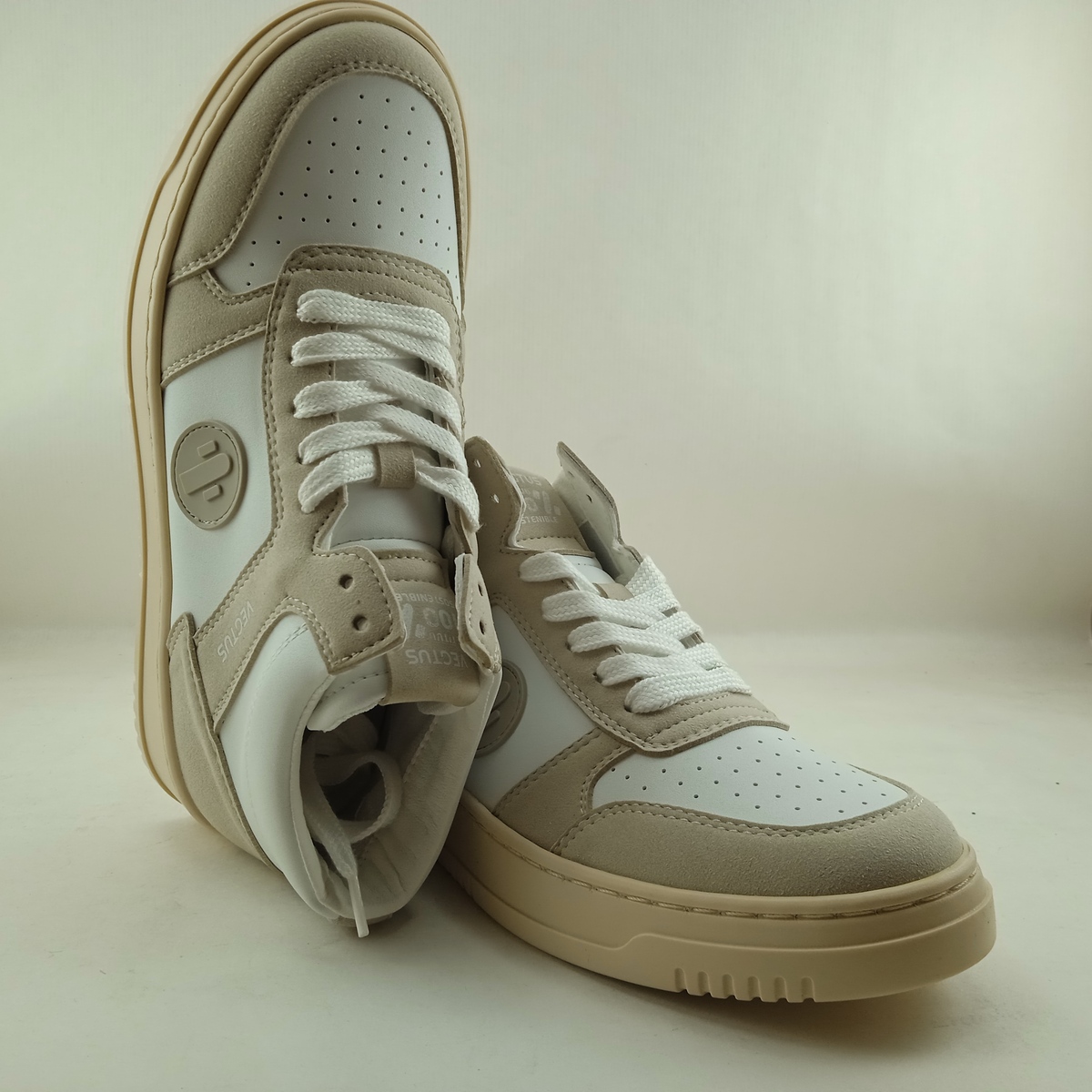 Semi-sport de piel blanca con cierre de cordon en empeine central y suela de goma, detalle del logo en color camel en el lateral, plantilla y forro textil.