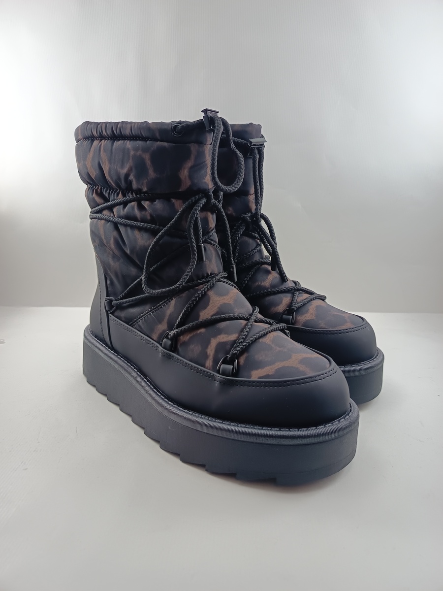 Bota de peil multicolor con cierre de cordon y suela de goma, forro y palntilla textil, detalle de leopardo en toda ella.