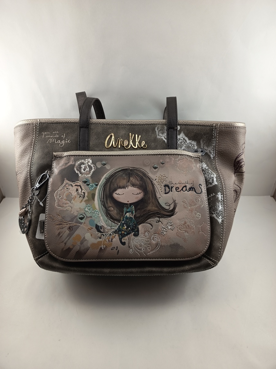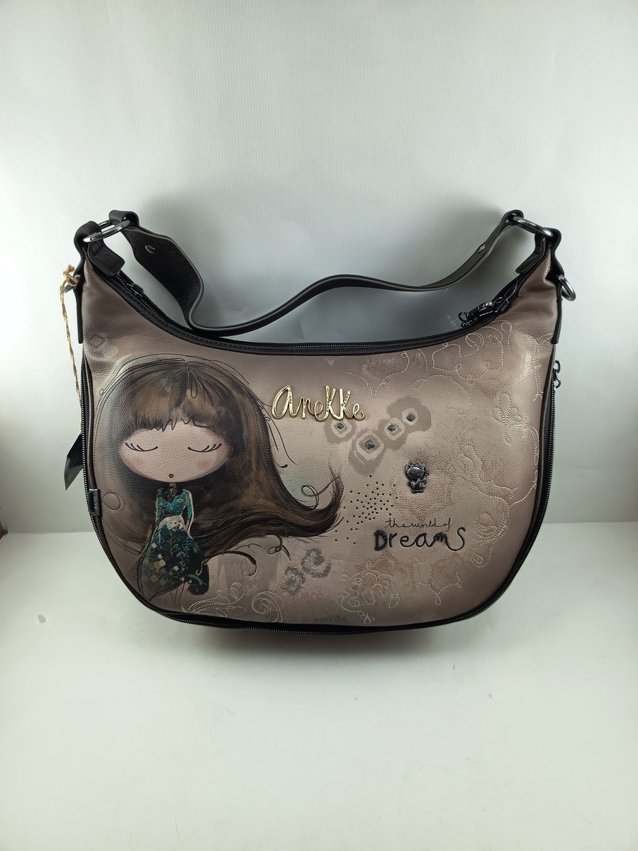 Bolso de hombro sintetico multicolor con cierres de cremallera y varios departamentos interiores, detalle de la muñeca en lateral exterior.