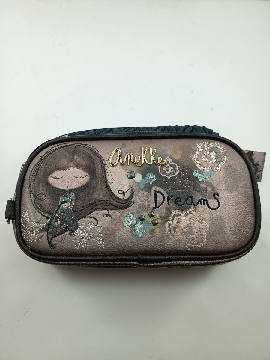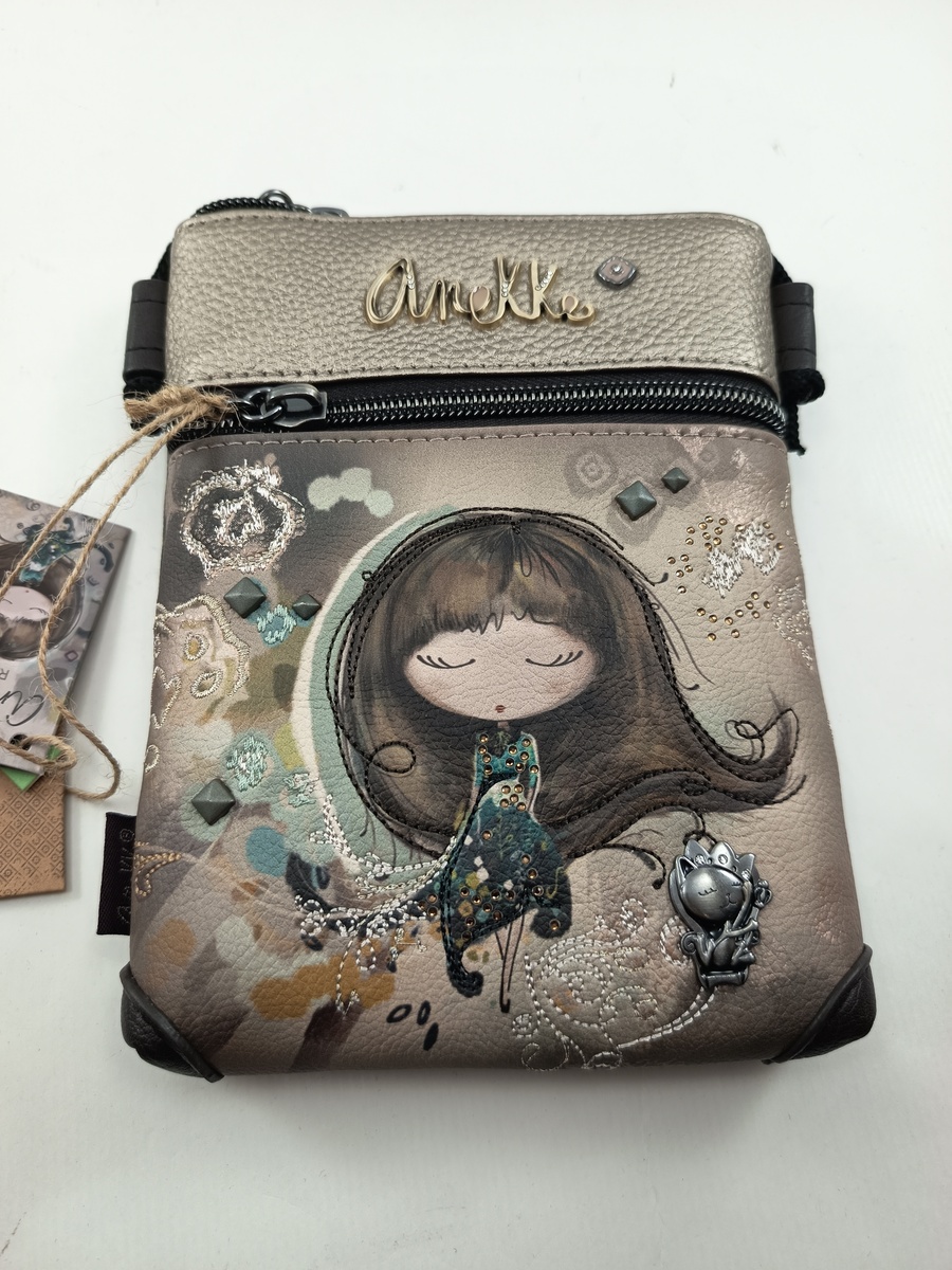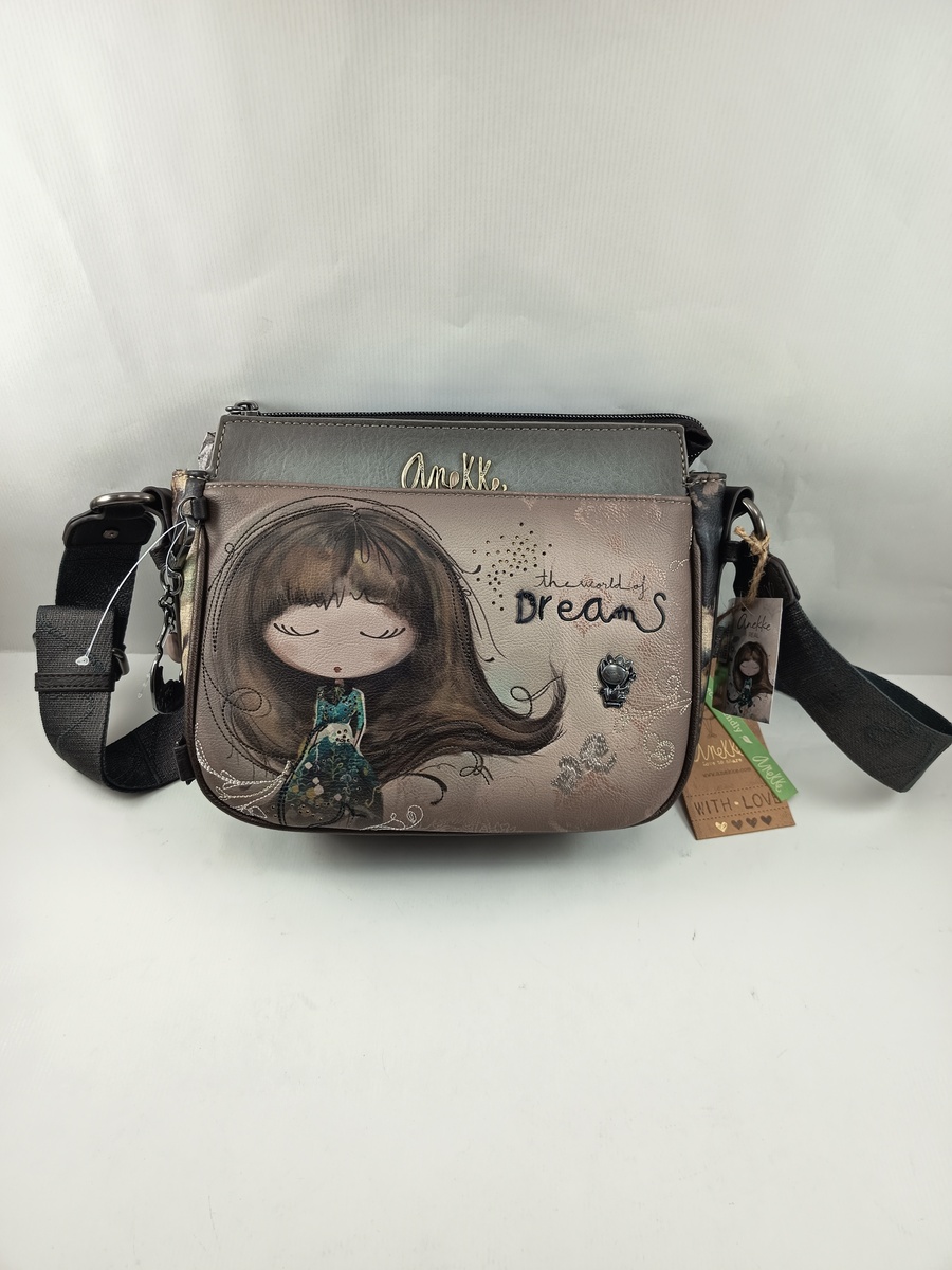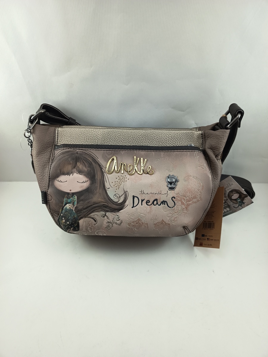 Bandolera sintetica multicolor con cierre de cremallera y varios departamentos interiores, detalle de la muñeca en lateral exterior.