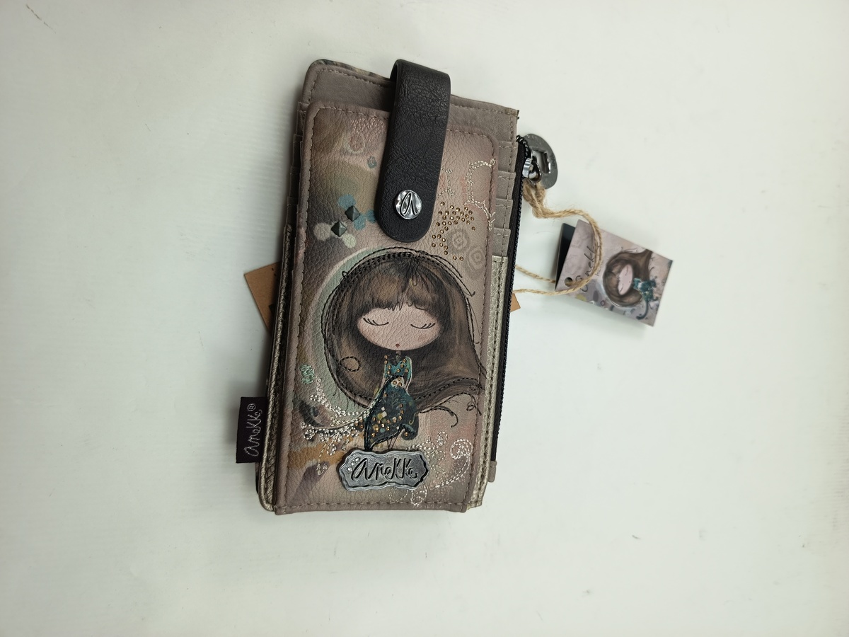 Tarjetero sintetico multicolor con cierre de cremallera y varios departamentos.