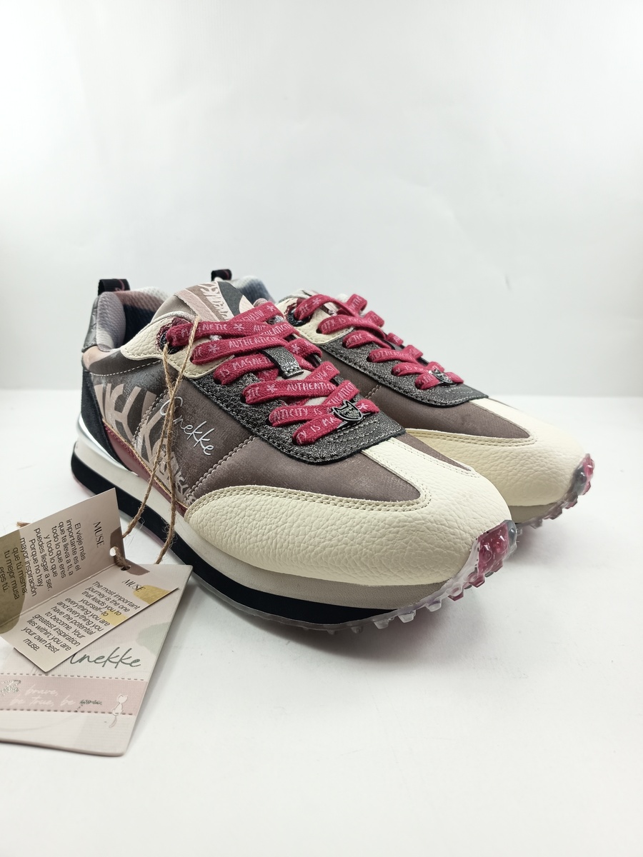 Semi-sport de piel rosa con cierre de cordon y suela de goma, forro y plantilla textil, detalle de pinceladas multicolor, comodas y ligeras.