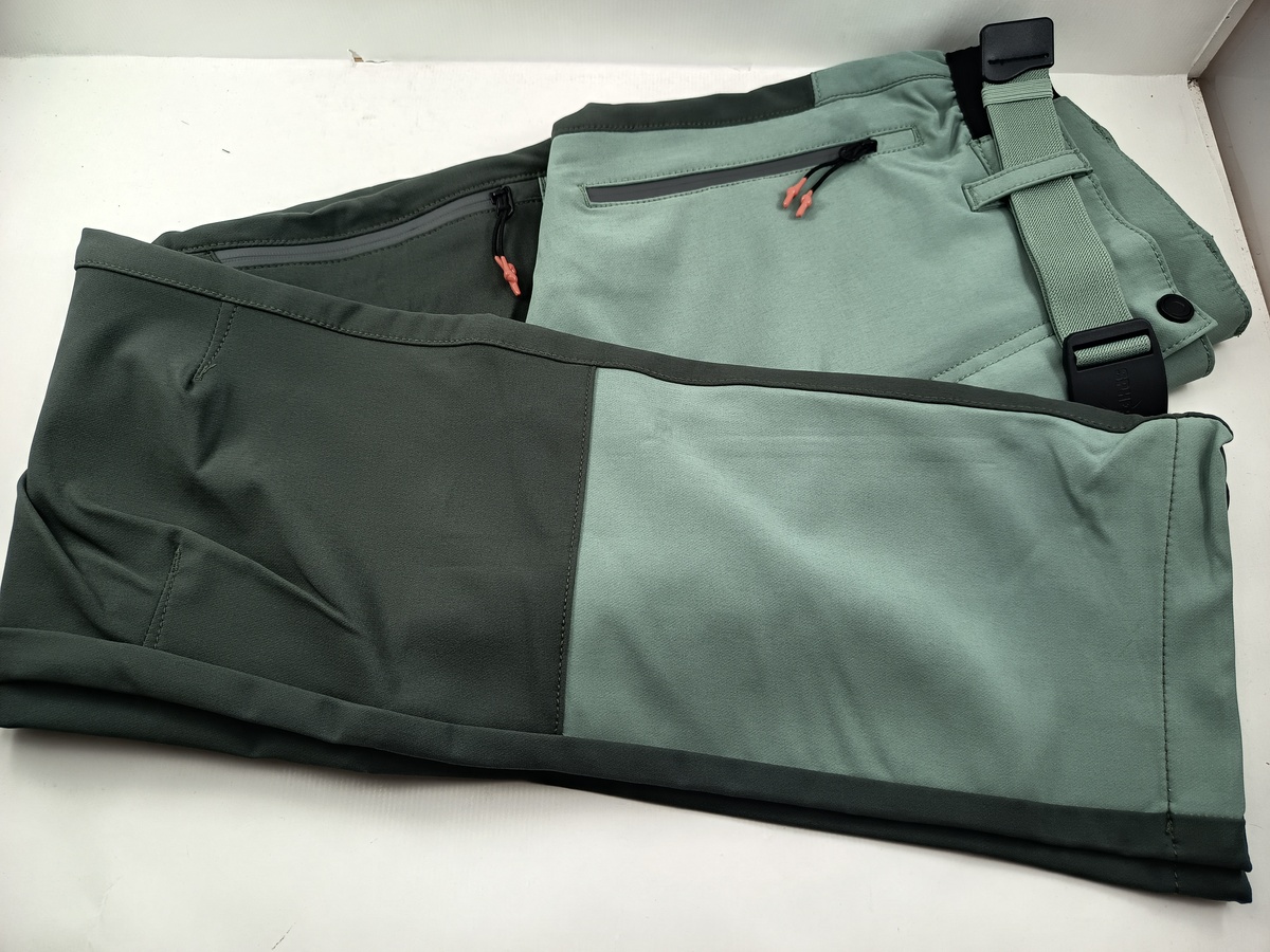 Pantalon sintetico verde con cierre de boton y cremallera, detalle de acabados en negro.