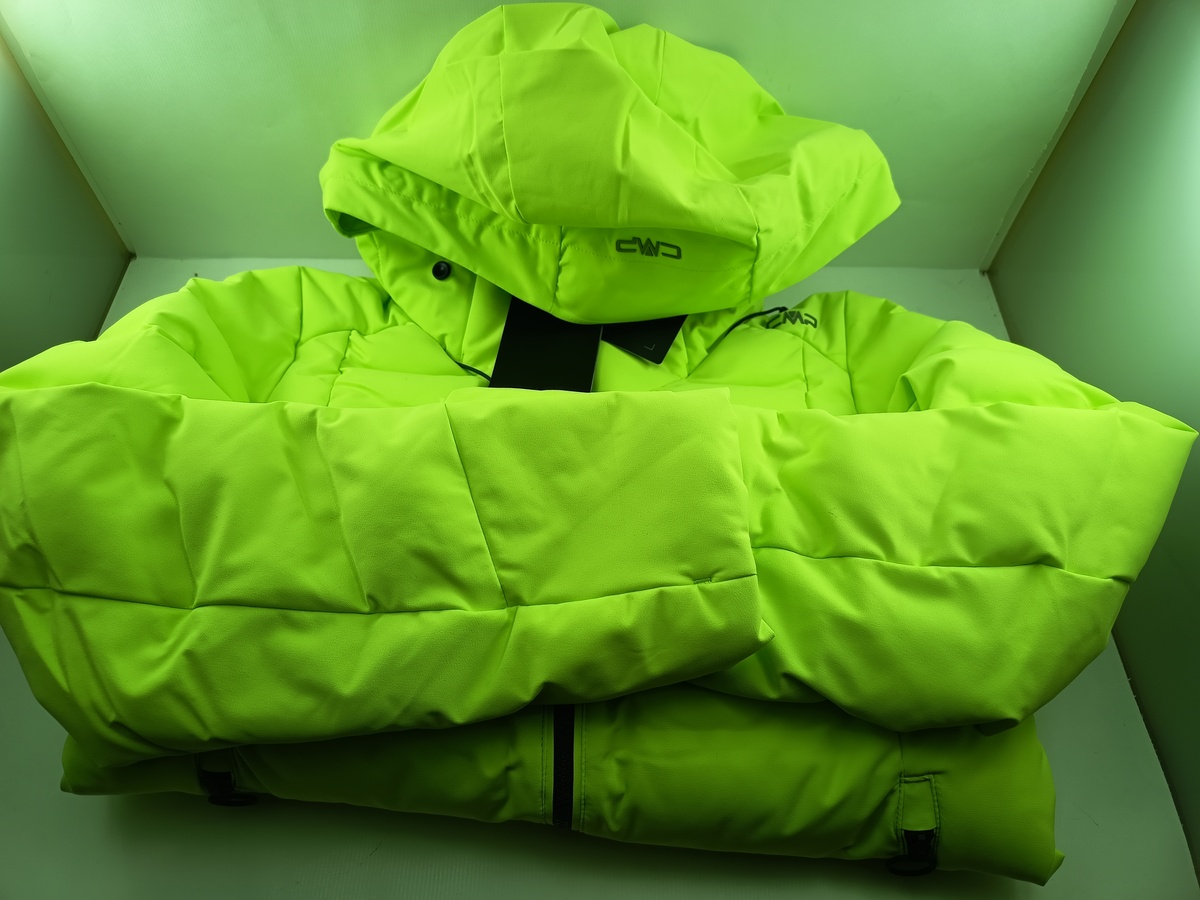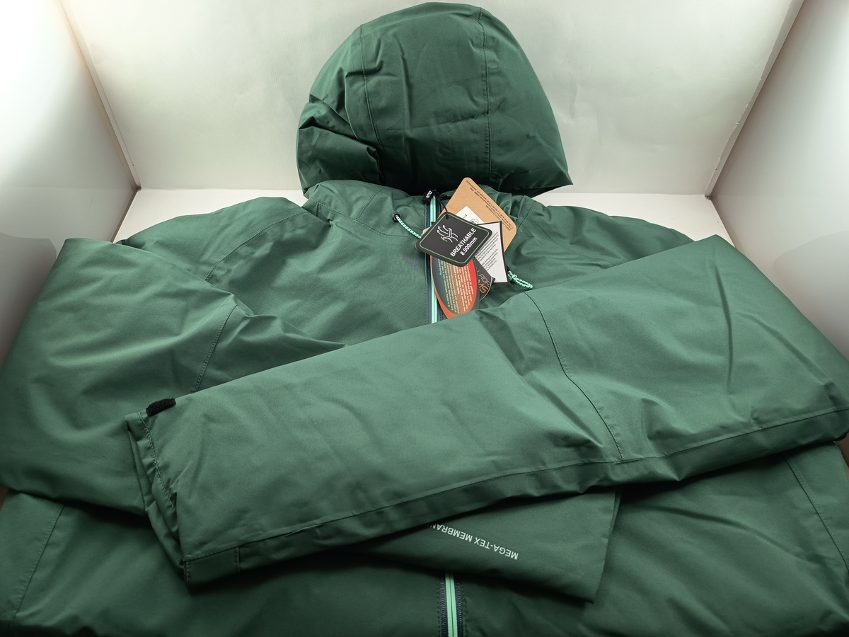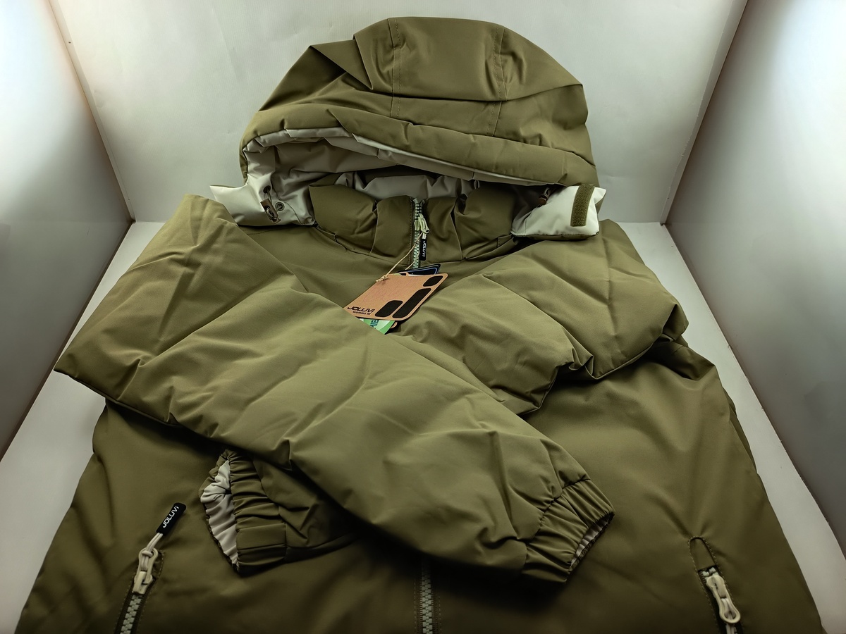 Chaqueta sintetica verde con cierre de cremallera y puños, detalle de capucha.