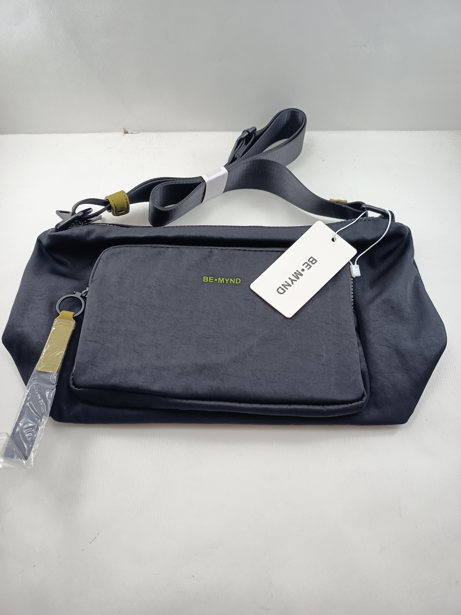 Bandolera sintetica negra con cierre de cremalleras y varios departametnos interiores y exteriores.