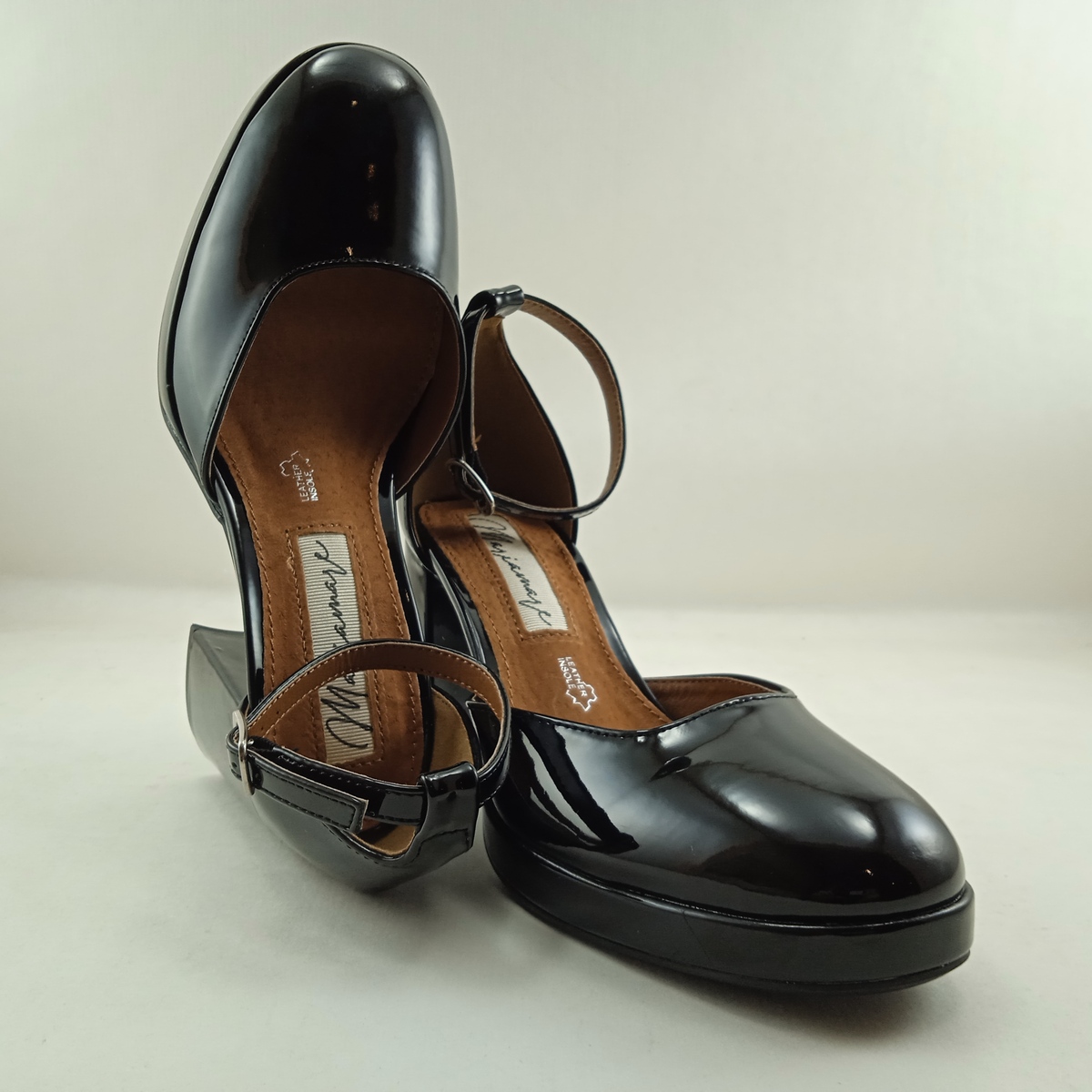 Mercedes de charol negro con cierre de hebillas y suela de goma, forro y plantilla de piel.
