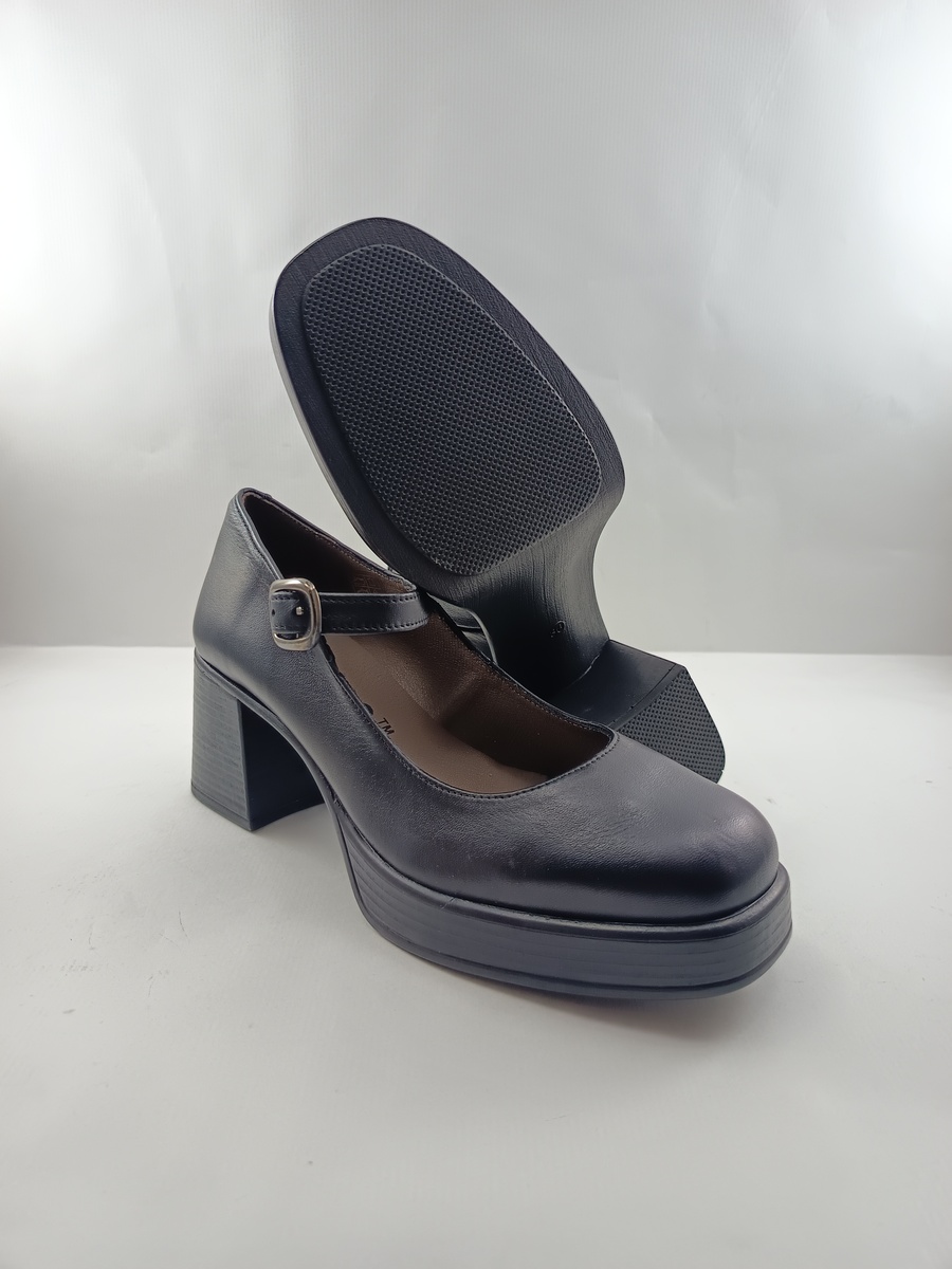 Zapato de vestir en piel negra con cierre de hebilla en tobillo y suela de goma, incorpora plataforma delantera de 2cm para mayor estabilidad.