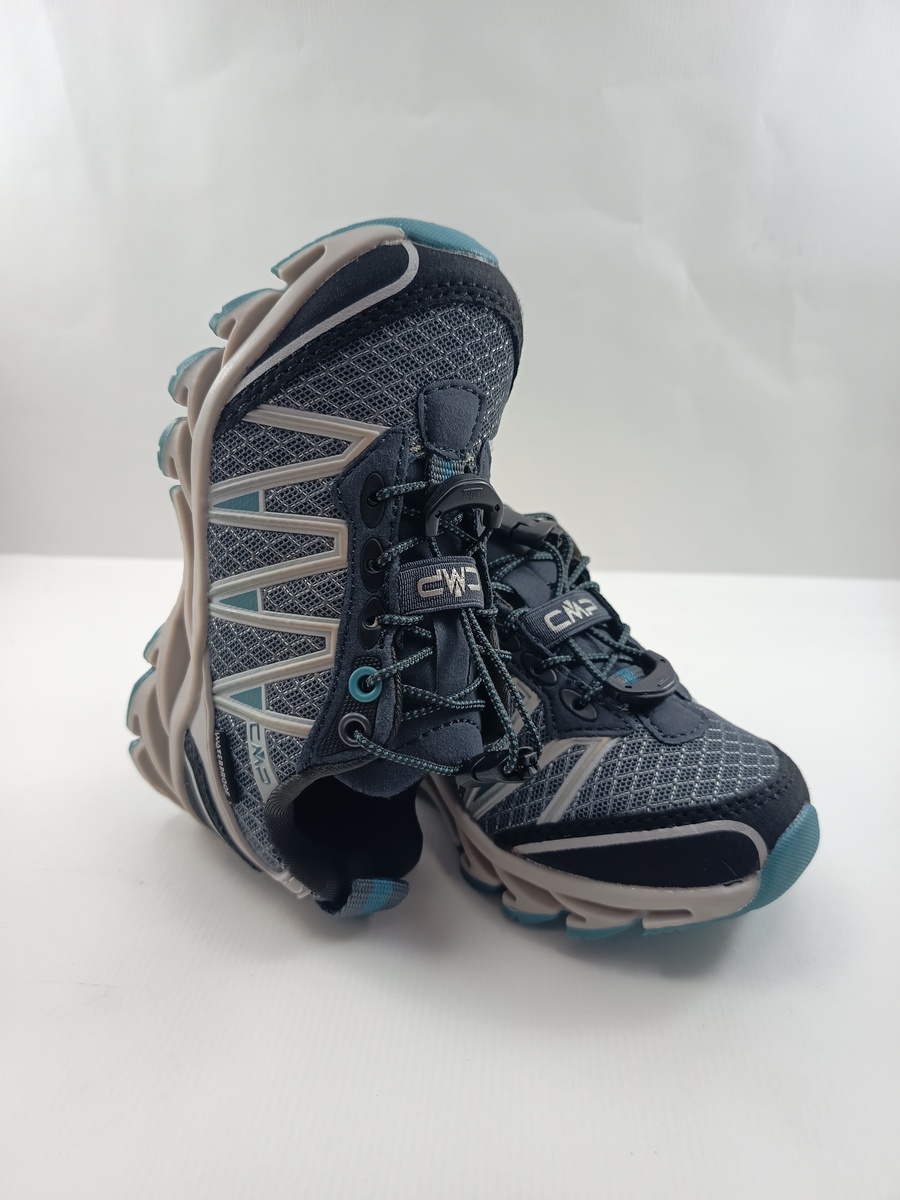 Deportivo waterprof sintetico gris con cierre de cordon elastico y suela de goma, forro y plantilla textil, detalles de acabado en negro.