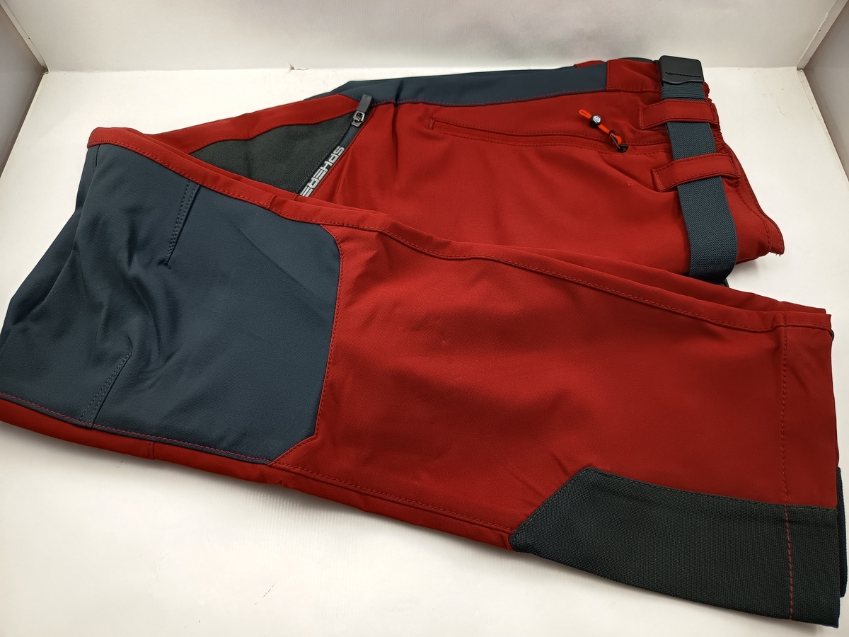 Pantalon sintetico naranja con cierre de crec y detalle de cinturon con bolsillos con cremallera.