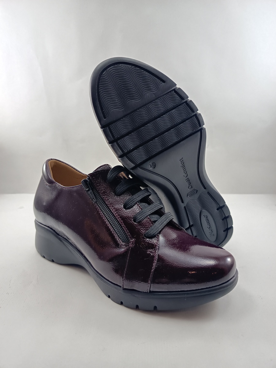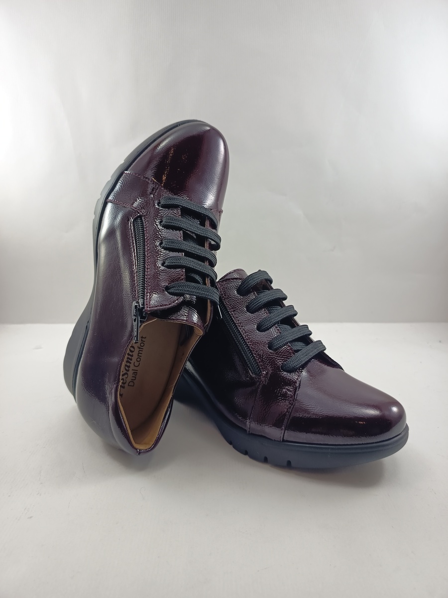 Abotinado de charol granate con cierre de cordon y cremallera y suela de goma con cuña de 2, forro y plantilla textil.