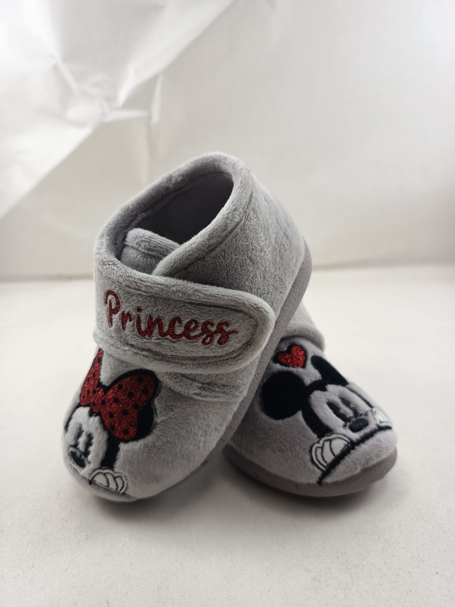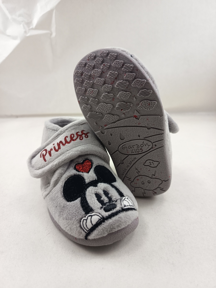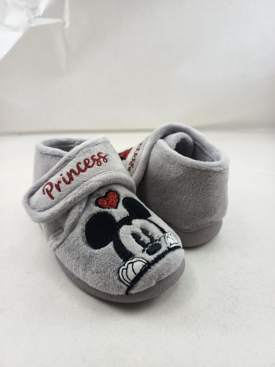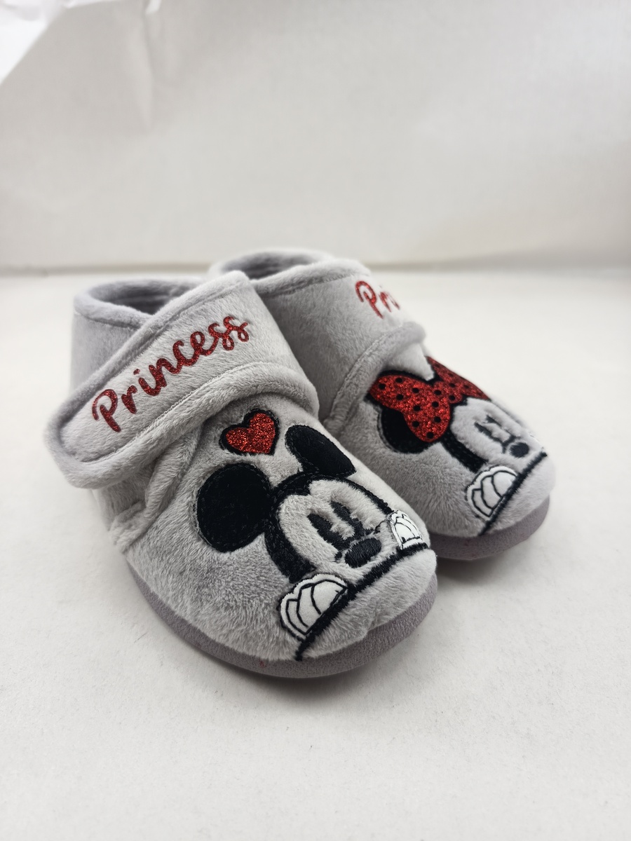 Alpargata de bota sintetica gris con cierre de velcro y suela de goma, forro y plantilla textil, detalle de ratones en empeine.