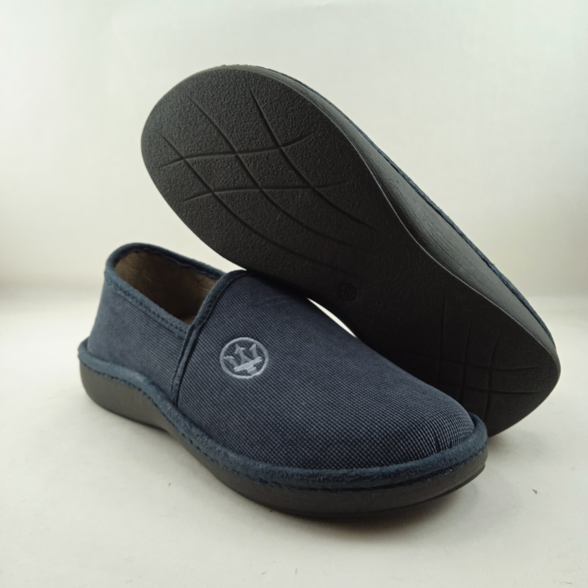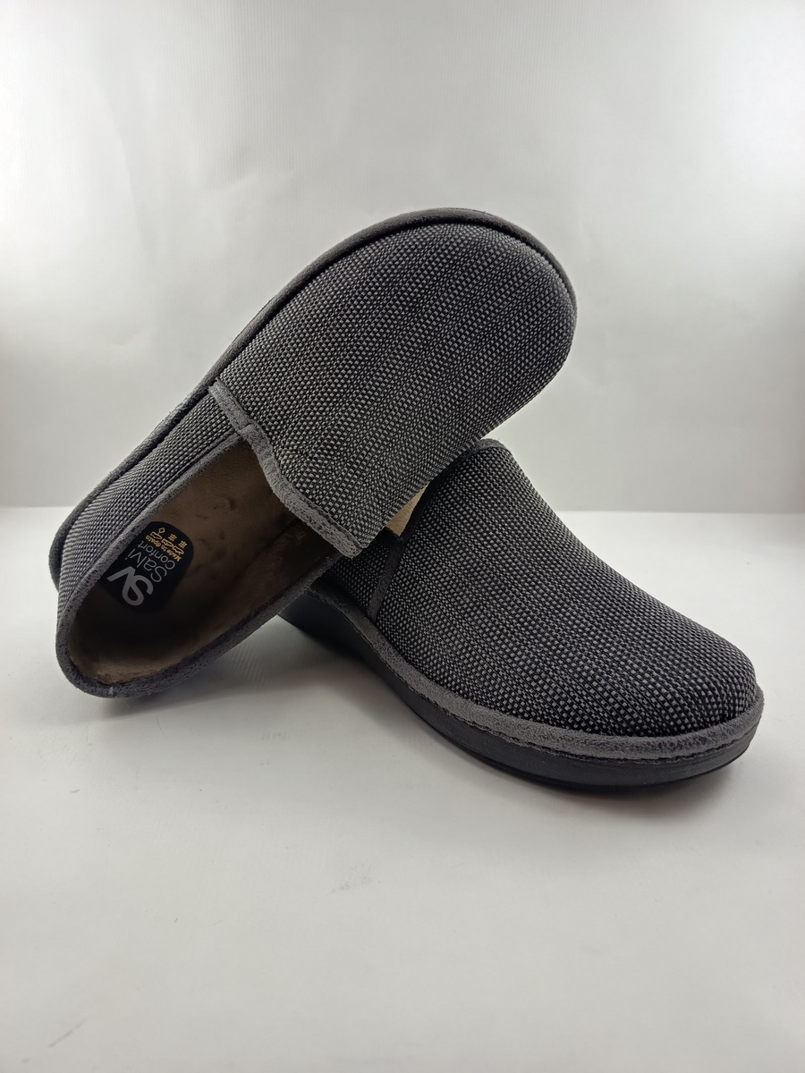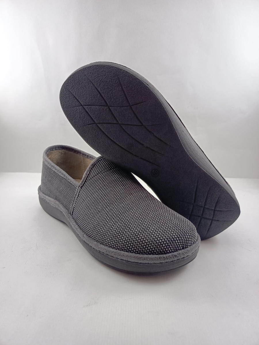 Alpargata de casa gris cerrada con suela de goma, forro y plantilla de feltro.