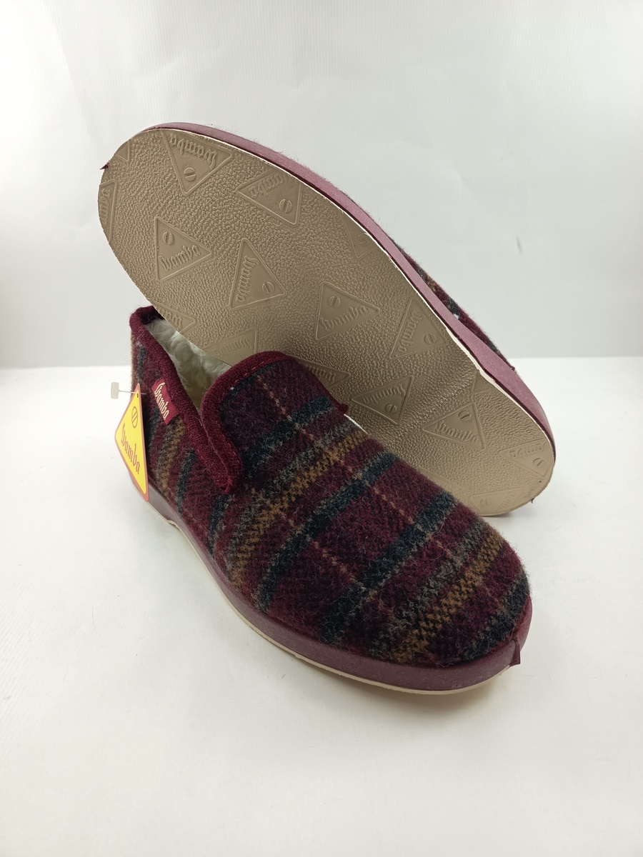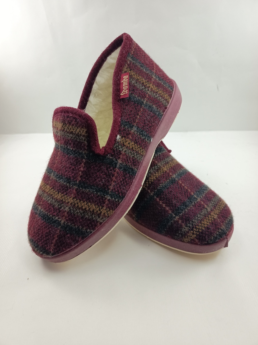 Alpargata de casa sintetica granate sin cierres y suela de goma, forro y plantillas de borreguito, detalle de cuadros en toda ella.