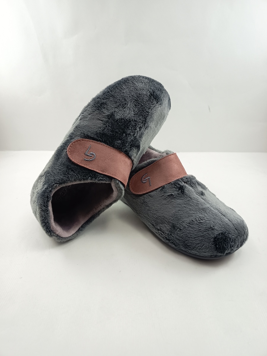 Alpargata de casa sintetica gris con cierre de velcro y suela de goma, forro y plantilla textil, detalle de velcro en rosa.