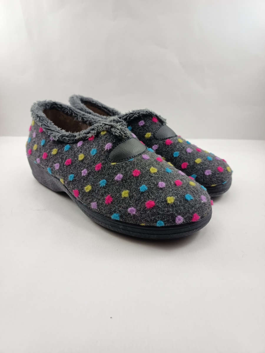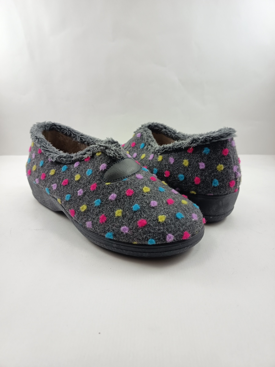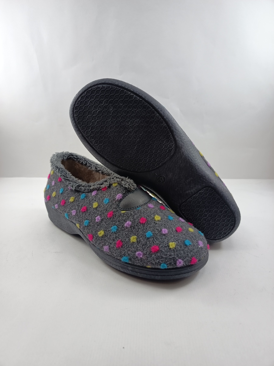 Alpargata de casa sintetica gris sin cierres y suela de goma, forro y plantilla textil, detalle de puntos multicolor en toda ella.