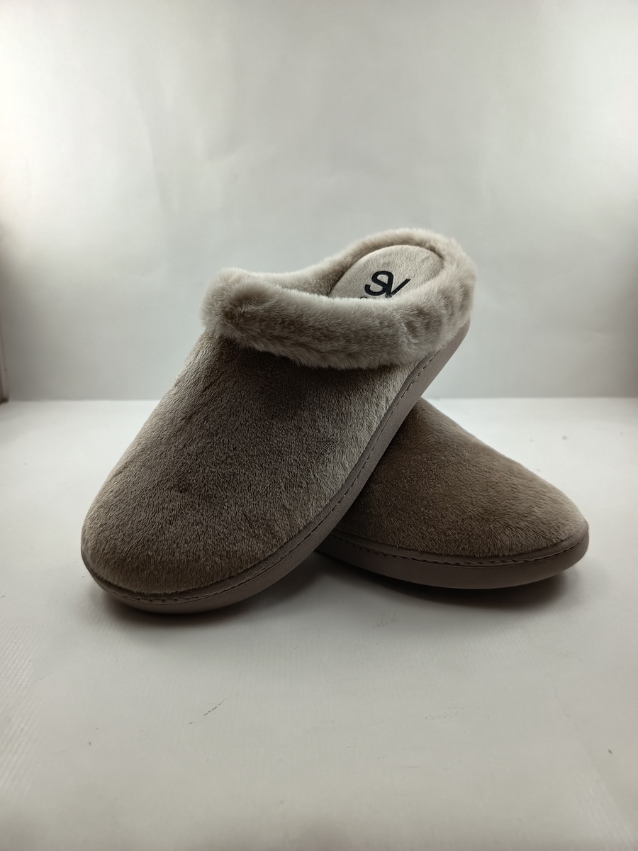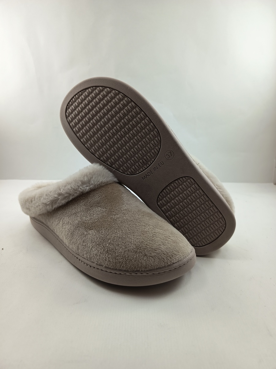 Alpargata de casa tipo chancla sin cierres y suela de goma, forro y plantilla textil, detalle de cuello con pelo.