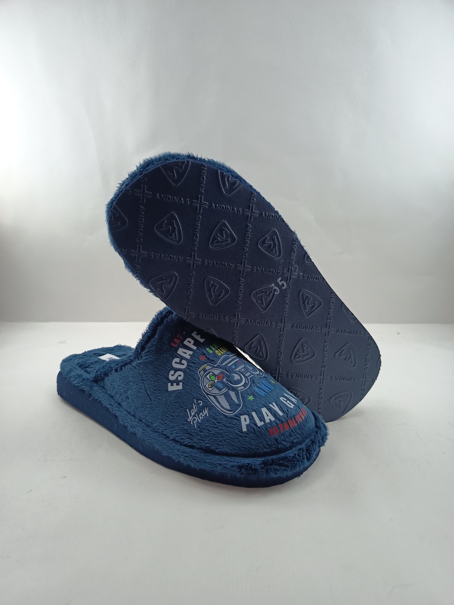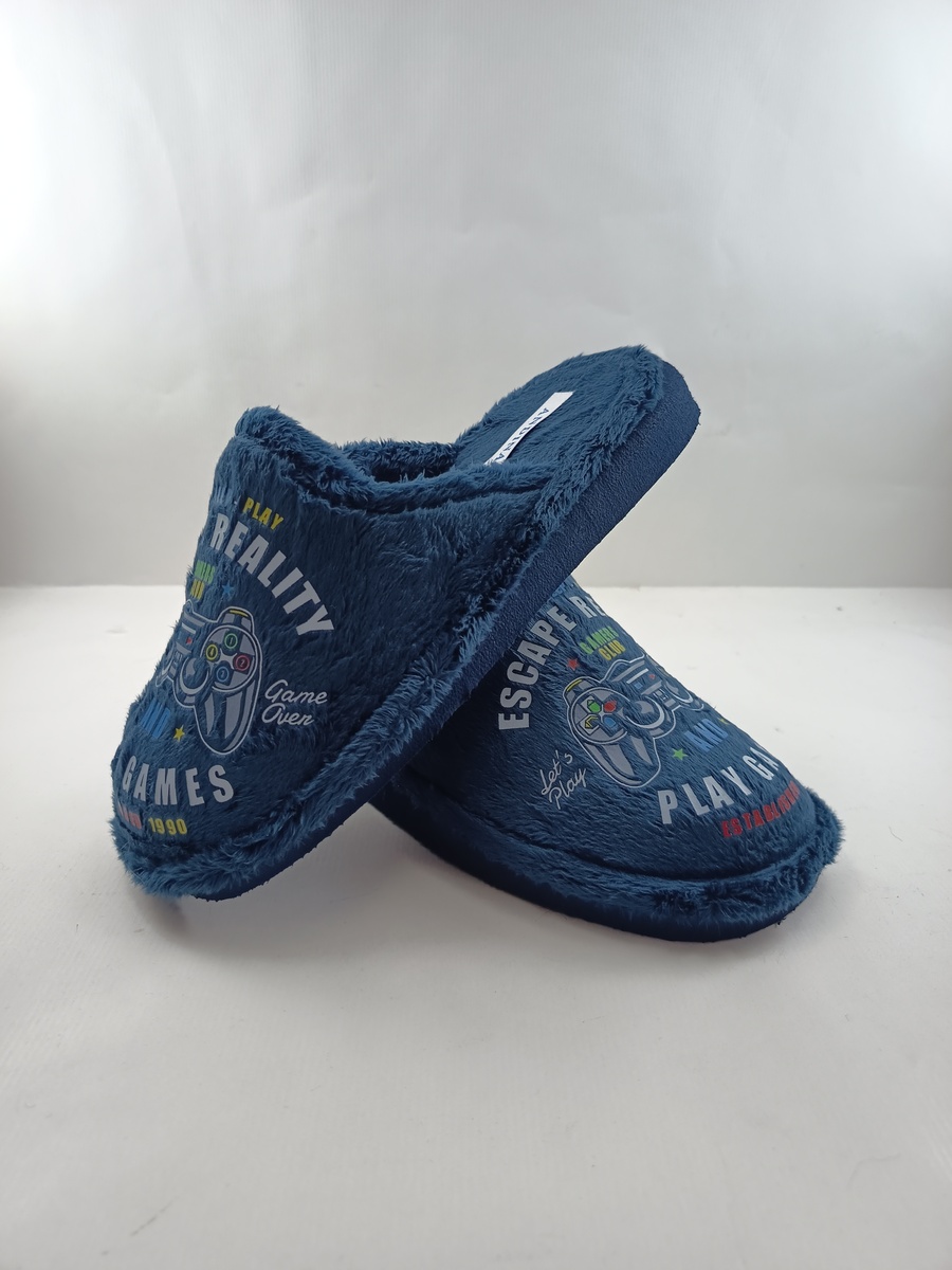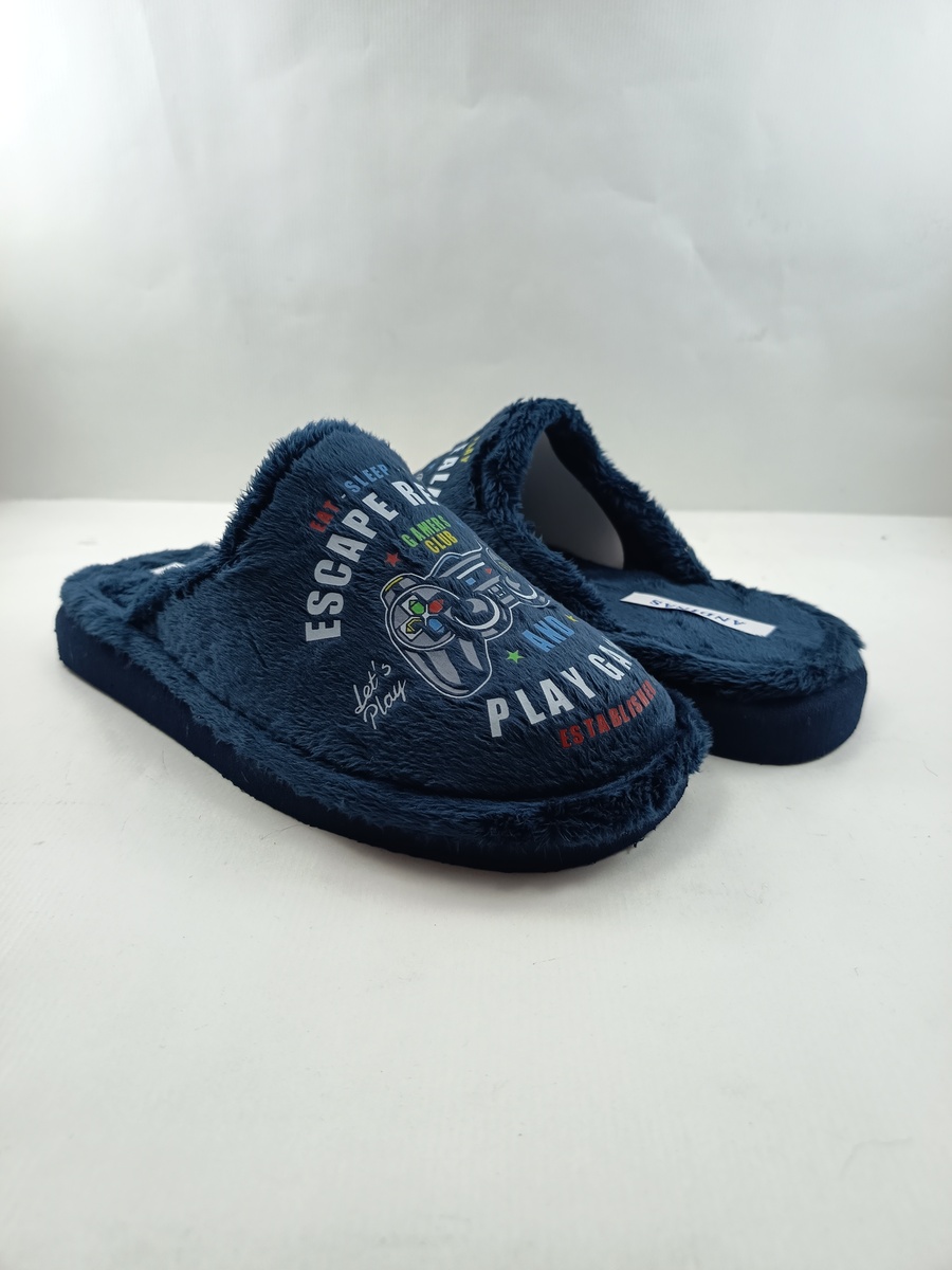 Alpargata de casa tipo chancla sintetica azul sin cierres y suela de goma, forro y plantilla textil, detalle mando play en empeine.