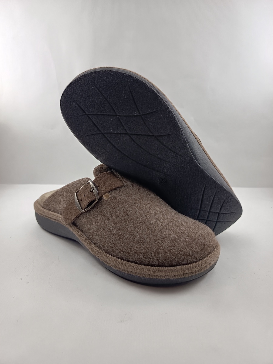 Alpargata de casa tipo chancla sintetica camel sin cierres y suela de goma, forro y plantilla textil, detalle de hebillla en empeine.