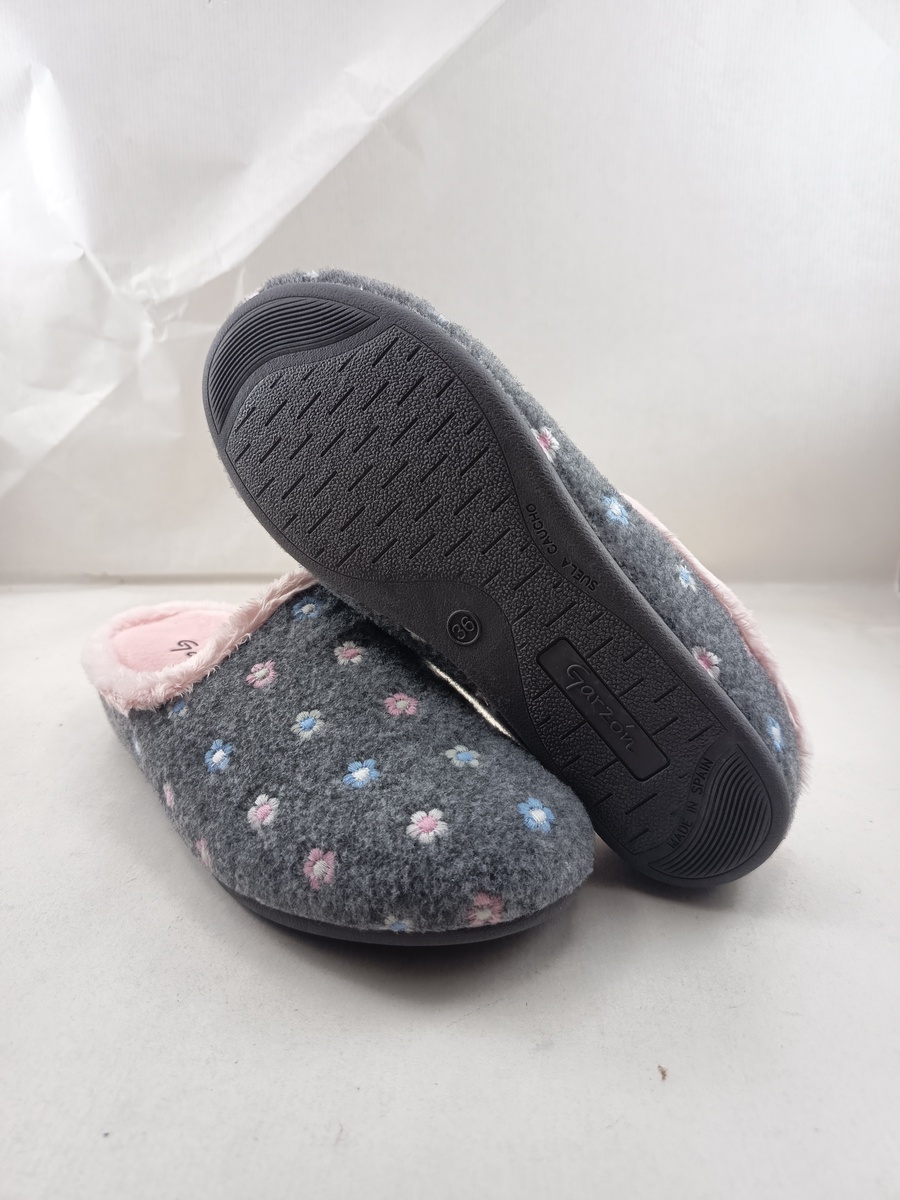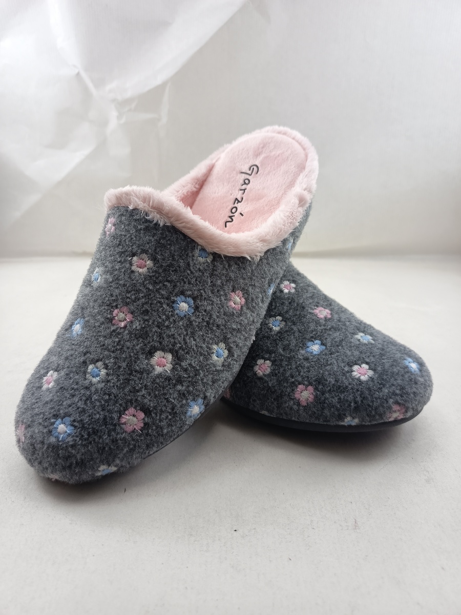 Alpargata de casa tipo chancla sintetica gris sin cierres y suela de goma con cuña de 2, forro y plantilla textil, detalle de flores en toda ella.