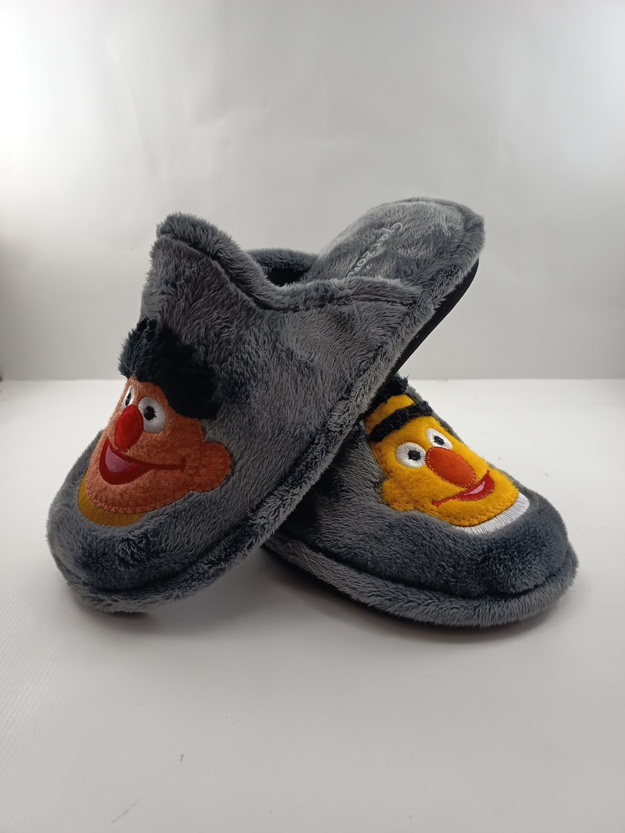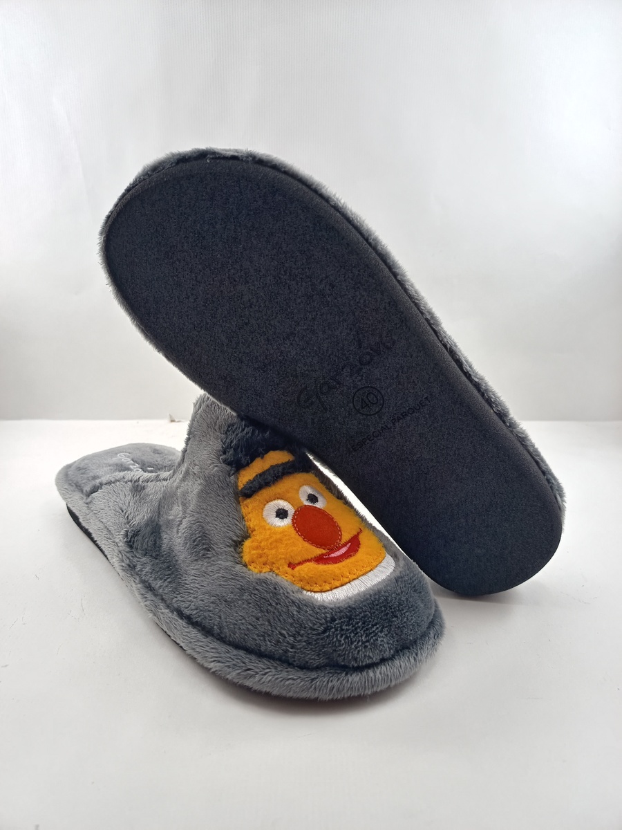 Alpargata de casa tipo chancla sintetica gris sin cierres y suela de goma, forro y plantilla textil, detalle de muñecos en empeine.
