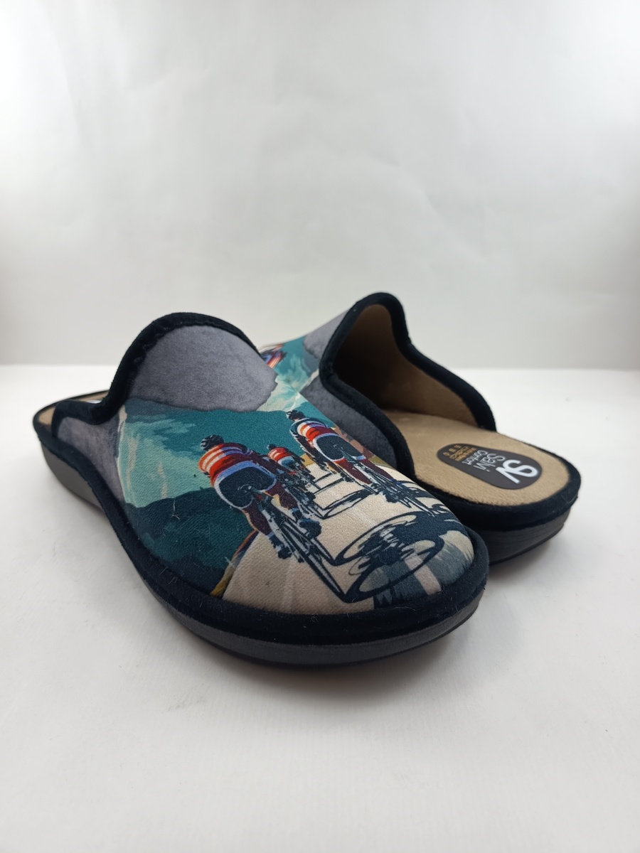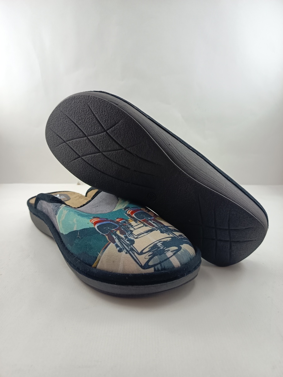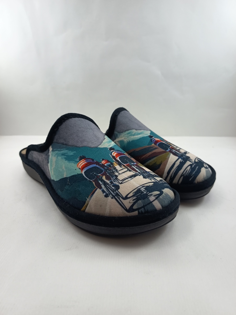 Alpargata de casa tipo chancla sintetica negra sin cierres y suela de goma, forro y plantilla textil, detalle de dibujo en empeine.
